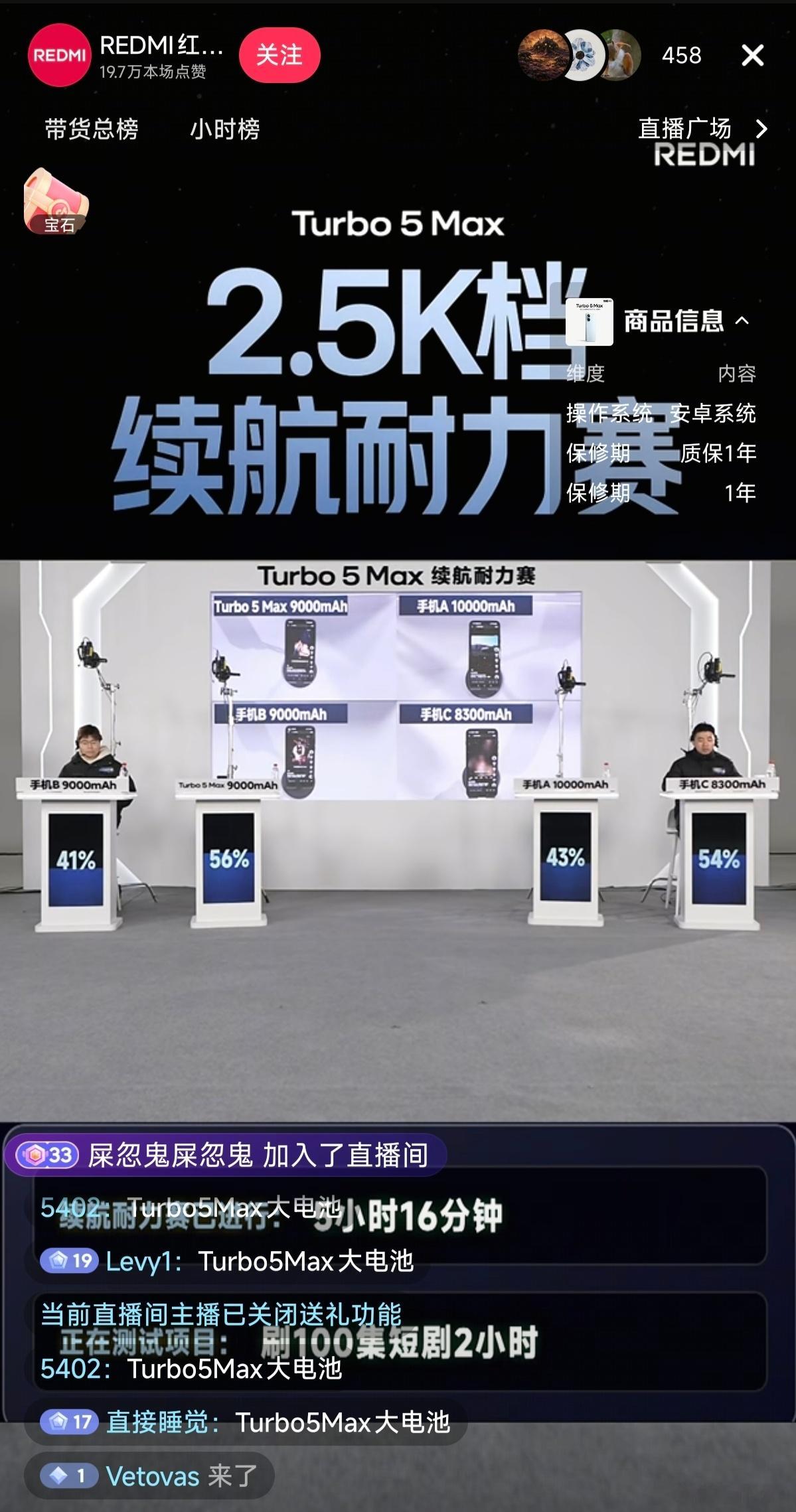 Turbo 5 Max续航耐力赛已经进行了5个多小时,Turbo 5 Max(9000mAh)电量还剩56%,手机A(10000mAh)电量还剩43%,手机B(9000mAh)电量还剩41%,手机C(8300mAh)电量还剩54%。目前Turbo 5 Max剩余电量最多,8300mAh的手机C表现也很好,你们觉得哪台手机会在本次续航测试中胜出?