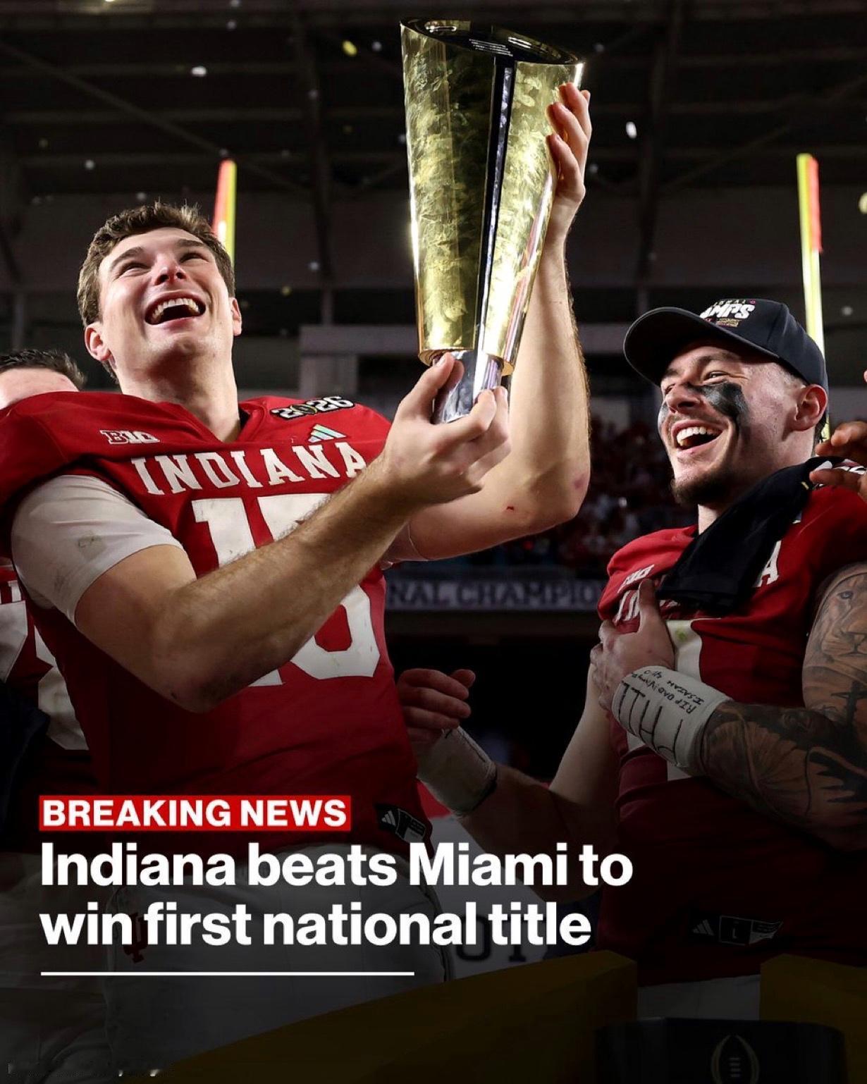 创造历史!印第安纳州赢得了冠军!印第安纳大学的胡斯人队——这支长期以来在大学橄榄球赛场上不被看好的球队——赢得了校史上的第一个全美冠军。 印第安纳胡斯人队已经从大学橄榄球的笑柄变成了全国冠军。在一场史诗般的大学橄榄球季后赛全国冠军赛中,胡斯人队以27-21的比分战胜迈阿密飓风队,获得冠军。 这是许多大学橄榄球迷从未想过他们会看到的东西:印第安纳胡斯人队是大学橄榄球的全国冠军。 长期以来,Hoosiers一直被认为是一所篮球学校,印第安纳州被称为全国篮球狂热地区。这将彻底改变,当地时间周一,印第安纳胡斯人队在2025-26大学橄榄球季后赛全国冠军赛中以27-21的比分击败了迈阿密大学飓风队。创造了现代第一个16-0的赛季,从而以不败的战绩将自己写入了大学橄榄球的历史。