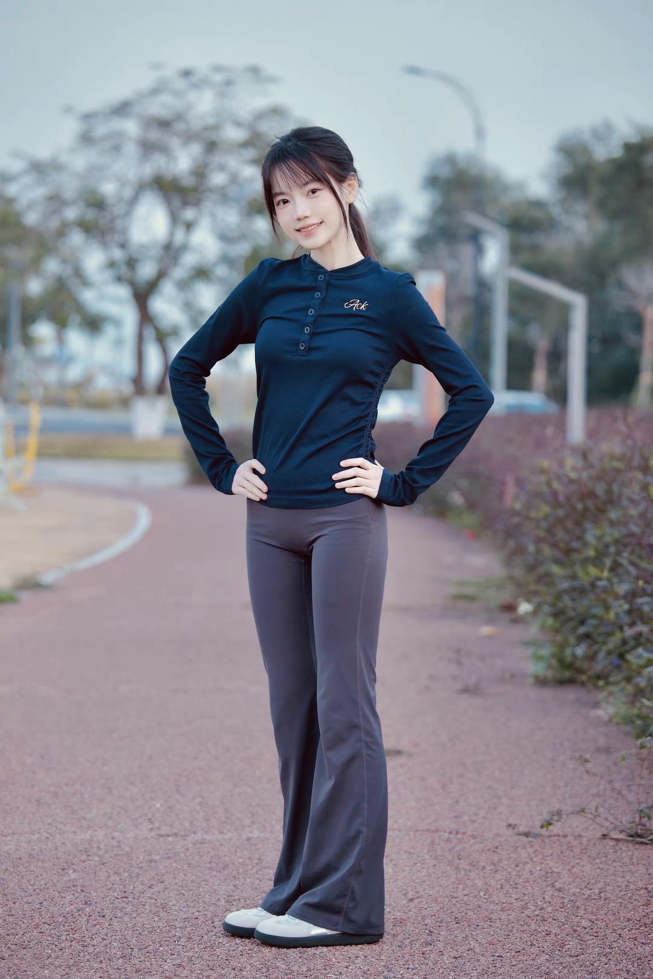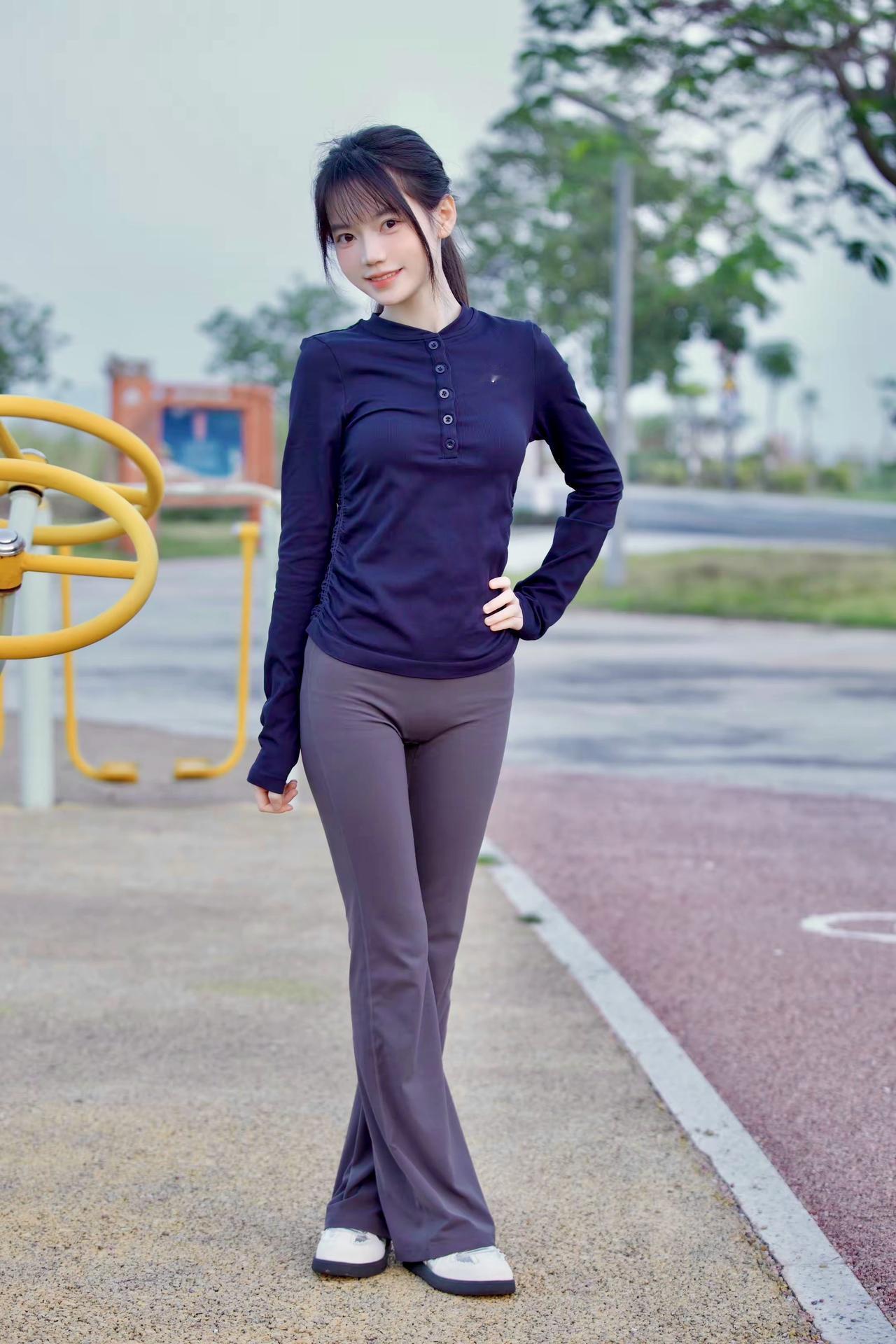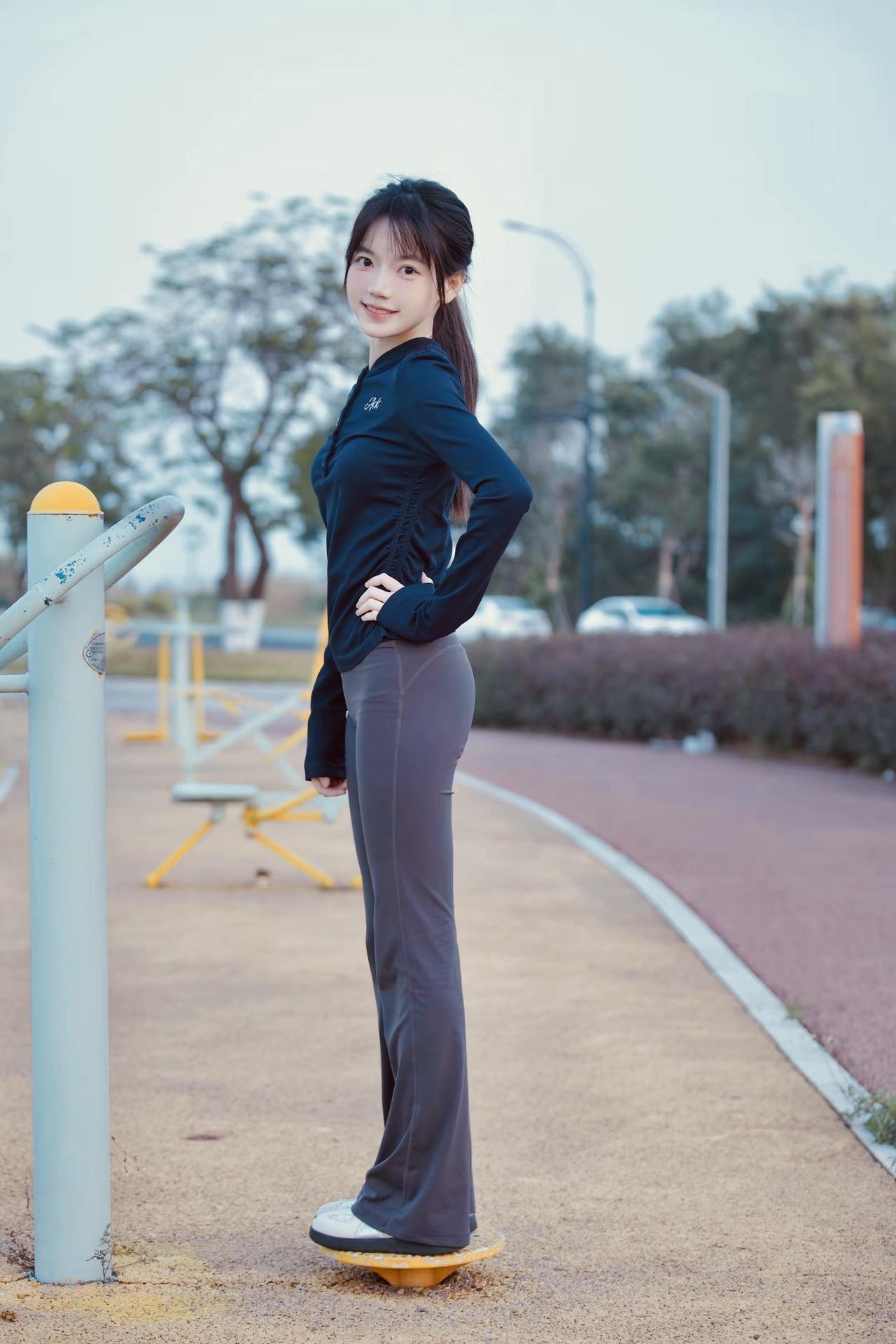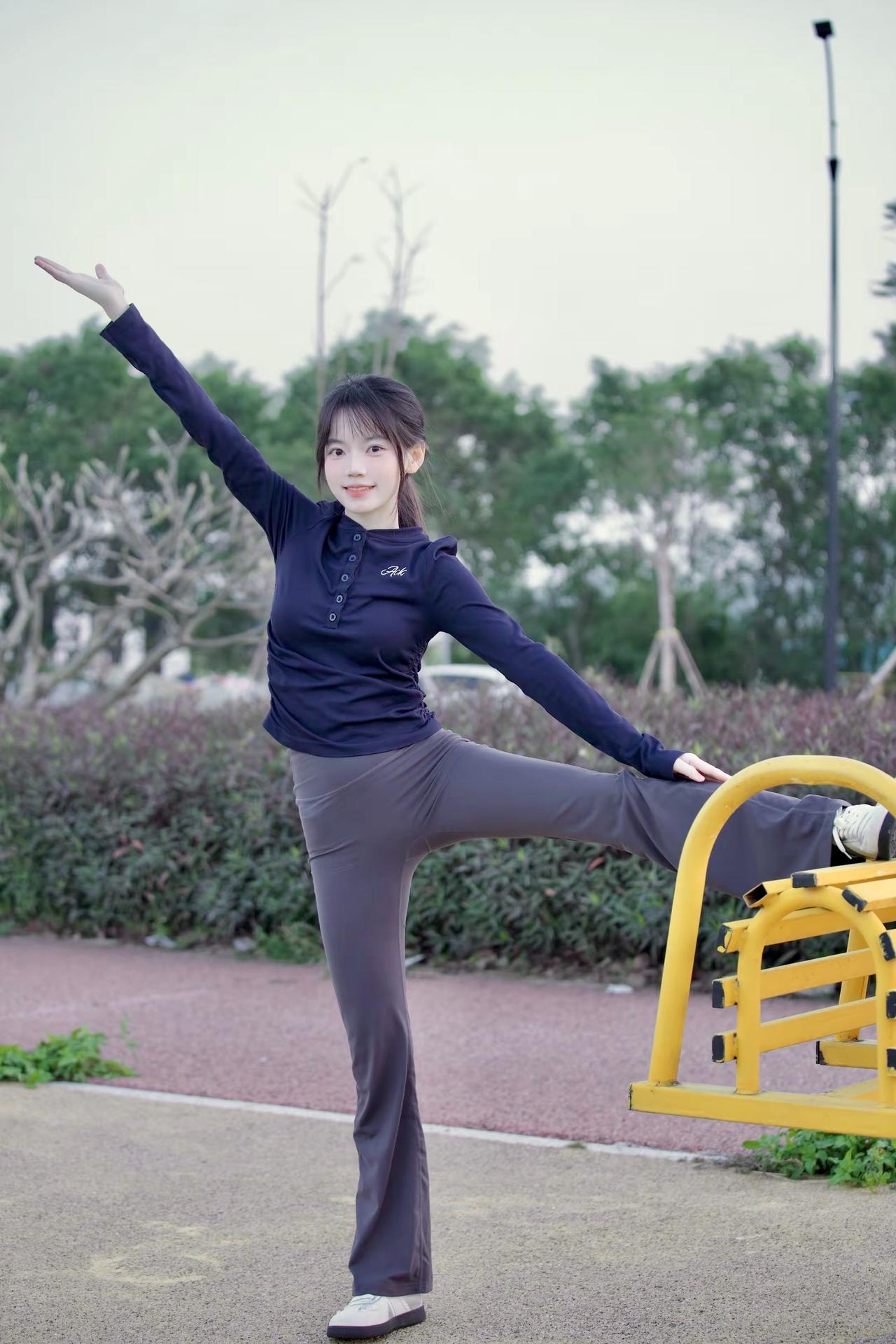 一个女孩在公园里做运动。