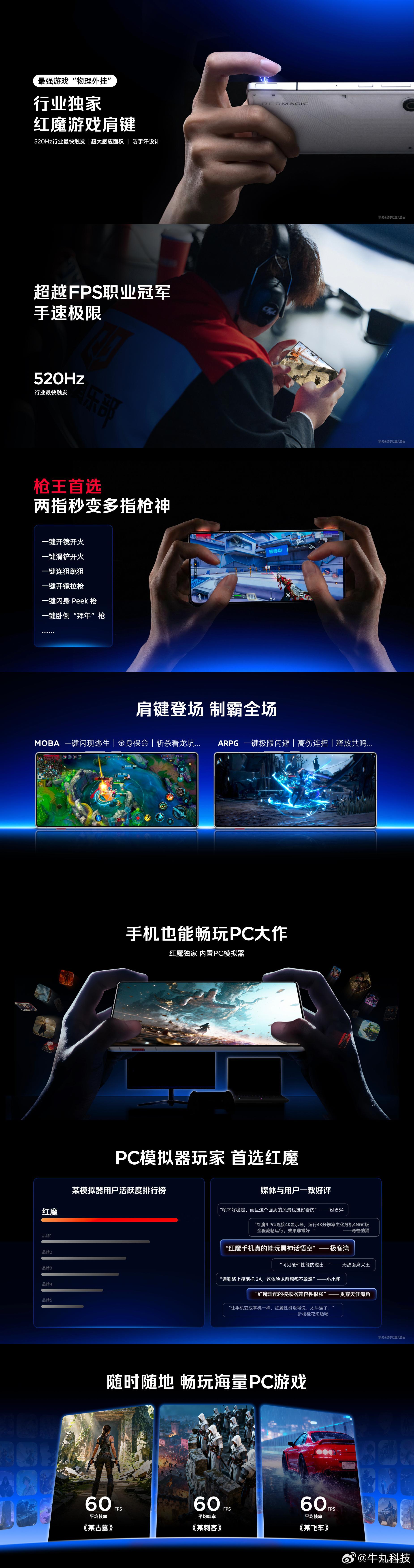 红魔11Air以满配实力重塑电竞手机标杆,带来从操作到续航的全维升级。行业独家游戏肩键堪称物理外挂,520Hz超快触发速度搭配超大感应面积与防手汗设计,让多指操作精准跟手,制霸赛场轻松无忧。更有独家内置PC模拟器,让手机秒变掌中游戏机,畅玩各类PC大作,成为模拟器玩家首选。散热方面,ICE魔冷散热系统堪称同档天花板。Air系列首款驭风4.0主动散热风扇,24000r/min高转速带来行业顶尖的风压与风量,搭配静音设计不扰体验;行业首创超厚冰阶VC,双面凸起结构与高密度毛细回流方案,高效导出核心热量。续航与功能同样拉满,7000mAh超大电池搭配120W魔闪快充,旁路充电技术兼顾快充与电池寿命。4D震感X轴马达、立体声扬声器等电竞配置齐全,全功能NFC与红外遥控提升实用性,5000万超感光主摄+OIS光学防抖,让电竞旗舰也能拍出清晰大片,兼顾娱乐与日常。红魔11Air牛丸科技说