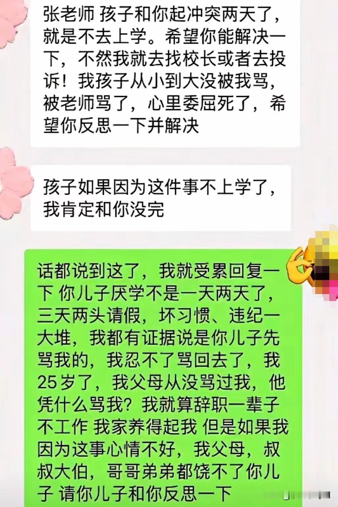 家底撑腰不怵投诉 25岁年轻老师硬刚无理家长的事儿爆火全网。 学生逃课违纪还辱骂师长,被老师批评后,家长直接叫板学校,声称孩子“从小没被骂过”,要求老师深刻反思,否则就投诉到底。没成想这位老师是个硬茬,当场甩出学生违纪的实证,还撂下狠话:“我家养得起我,辞职也无所谓”。一番操作下来,把家长的投诉威胁拿捏得死死的。 这位老师的底气可不是凭空来的,家里几代人的积累就是她的后盾,不用像老一辈那样为五斗米折腰。现在的年轻老师入行,不少都带着这样的“资本”,不再一味迁就无理要求,反倒成了整顿职场风气的一股清流。被家长捧成“巨婴”的学生,习惯了撒泼打滚管用,这次碰壁算是栽了跟头。 网友清一色站老师这边,觉得家长惯子太离谱,社会就该好好教教规矩。后续这类家校矛盾可能会越来越多,老师会不会更敢坚持原则。 你支持老师的硬刚做法吗?评论区来聊聊。