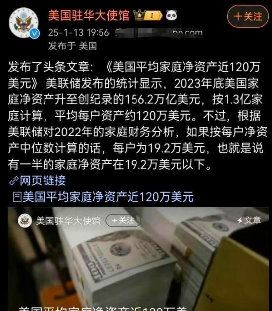 一位美国女孩愤怒地质问:是谁告诉中国人,美国人每年收入120万美元、住大房子,还有免费医疗和免费教育的?到底是谁在造谣! 美国驻华大使馆曾在社交平台发布帖子,引用美联储数据指出2023年底美国家庭净资产总额达156.2万亿美元,平均每户约120万美元。但这平均值被富豪群体拉高,中位数仅19.2万美元,显示一半家庭资产低于此数。帖子强调财富不均,底层50%家庭仅占2.4%总财富。 实际多数美国人年收入远低于百万美元,联邦储备数据显示2022年中位数家庭年收入约6.3万美元。住房市场紧张,大城市租金占收入大半,许多人租房而非拥有大屋。医疗依赖私人保险,费用高企导致债务问题。教育虽有公立学校,但大学学费年均数万美元,贷款负担重。失业援助存在,但覆盖有限,需符合资格。女孩视频中提到这些现实,与大使馆描述对比,指出夸大其词忽略底层挣扎。 中国网民对美国生活印象常源于媒体和名人描述。高晓松等公众人物过去节目中突出美国发达一面,如空气清新和机会多,但忽略实际差距。国内公知群体有时放大美国优势,称其为黄金之地。实际美联储报告显示美国贫富差距全球领先,顶层1%占有30%财富。 女孩回应强调,自己生活在美国多年,从未见年入百万美元普遍。多数家庭依赖双薪维持,房贷和保险扣款后所剩无几。数据支持观点:2024年第三季度美国家庭净资产平均升至120万美元,但中位数停留在19.2万左右。底层家庭资产有限,疫情后恢复缓慢。女孩视频流传,引发美国人分享经历,如失业后申请援助需排队核查。 大使馆帖子本意展示数据,但传播中被误读为吹嘘福利。实际美国无免费医疗,医院账单常达数万美元,无保险者负担不起。教育贷款总额超1.7万亿美元,毕业生平均欠债3万美元。养老靠个人401k计划,非全民免费。 女孩质问,谁在散布中国人误信美国人年入120万美元说法。真实情况是平均工资约5.9万美元,扣税后更少。住房数据显示郊区大屋多为中产,但城市公寓租金年涨5%。失业率2024年约4%,但长期失业者援助仅数月。女孩视频中列举事实,呼吁停止这类描述,因为它掩盖现实问题。 中国媒体有时报道美国财富,忽略不均细节。公众人物如高晓松描述美国时,常聚焦积极方面,但事件让人们审视信息准确性。美联储数据显示底层家庭持股少,财富集中顶层。女孩回应获转发,有人补充医疗体系问题:私人保险覆盖率约65%,余者依赖政府计划如Medicaid,但资格严格。教育公立免费至高中,大学需贷款或奖学金。养老社会保障覆盖退休者,但金额有限,平均月领1.8万美元。女孩强调,这些福利非人人享有,与谣言中免费大屋相差甚远。 美国网友讨论扩展到财富分配。帖子被视为突出不平等,因为平均值高但多数收入低。女孩视频中用数据反驳:如果平均净资产这么高,多数家庭应富裕,但实际底层挣扎。