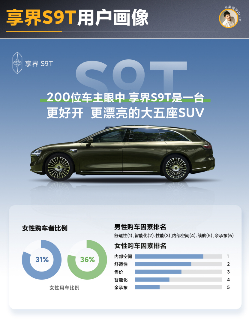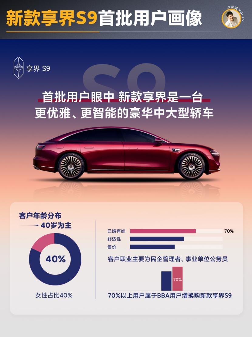 一图看懂享界的用户画像。享界S9,双车终端成交价持续走高,成功打入豪华轿车核心区,成为新豪华之选。享界S9T销量紧随BBA 56E,连续3个月销量位列TOP4,享界S9市场表现稳步提升。大v聊车享界S9T享界S9