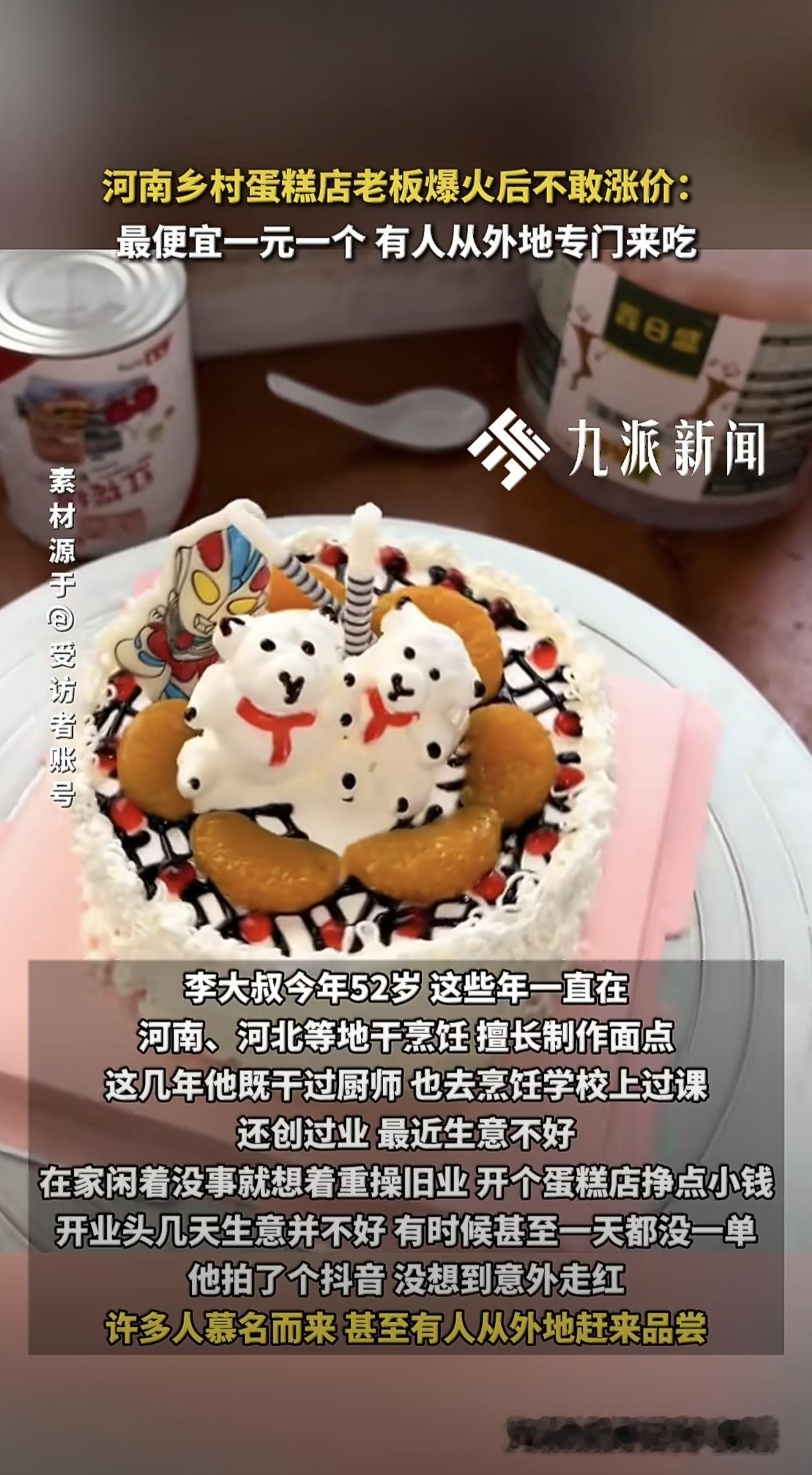 河南周口一乡村蛋糕店老板李大叔在抖音发了条做蛋糕的视频,结果评论区全在问“这蛋糕卖不卖”。走进店里一看,价格直接让人穿越回童年,纸杯蛋糕1块钱一个,4寸奶油蛋糕10块钱,6寸的才29.9元,连最大的8寸蛋糕也只要50块。网友们一边下单一边感慨:“现在连奶茶都喝不起了,居然还能买到10块钱的蛋糕?” 李大叔今年52岁,早年在河北学做面点,后来辗转各地打工,去年因为父亲身体不好就回了老家。他琢磨着村里消费低,干脆把自家院子改成蛋糕店,既省房租又能照顾老人。开业头半个月门可罗雀,李大叔急得直拍大腿,随手拍了段揉面团的视频发抖音,没想到第二天手机就响个不停,附近村的、县里的,甚至开封、驻马店的人开着车来买蛋糕。 “刚开始真没想赚钱,就想着别闲着。”李大叔挠挠头说。他定的价格比十几年前只涨了一点点,4寸蛋糕连包装盒成本都要1块5,算下来利润薄得像纸。但即便如此,他也不敢涨价:“网友都认准这个价了,涨五毛都要被说黑心。”现在全家总动员,两个儿子辞了城里的工作回来帮忙,哥哥也来叠盒子扫地,每天从凌晨四点忙到晚上七点,连吃饭都得见缝插针。 最让李大叔意外的是,城里顾客不买水果蛋糕,反而抢着要牡丹、荷花这些老式裱花。“现在蛋糕店都搞网红款,这种老花样反而成了稀罕物。”他说着掀开操作台,露出整盒的食用色素和裱花嘴,“有位郑州的阿姨说,看到我做的牡丹裱花,想起她妈结婚时的蛋糕,当场就哭了。” 别看蛋糕便宜,用料可不含糊。李大叔坚持用动物奶油加乳脂,水果都是当天去批发市场挑的。“有次草莓涨价,我差点用罐头果酱,结果网友尝出来说‘没那味儿’,吓得我赶紧换回新鲜的。”他边说边给刚出炉的蛋糕胚刷糖水,“现在每天能卖八九十份,单日收入几百块,虽然比打工强点,但真没大家想的那么赚钱。” 走红后也有烦恼。有天李大叔发视频说第二天要关门进货,结果当天晚上来了辆驻马店的车,车主说“开了两小时高速,总不能白跑”。李大叔二话不说重新开炉,硬是给人做了个蛋糕。现在他琢磨着限购,怕订单太多品质下降,“跑这么远来的,必须让人吃上热乎新鲜的。” 这个藏在村里的蛋糕店,用最朴实的方式戳中了大家的心。当城市里的蛋糕越做越精致,价格越标越高,李大叔的“童年价”反而成了稀缺品。有人说他是“烘焙界的清流”,也有人担心这种低价模式能撑多久。但李大叔倒看得开:“先干着呗,能帮乡亲们解解馋,让城里人找找回忆,这买卖就不亏。”来源:九派新闻