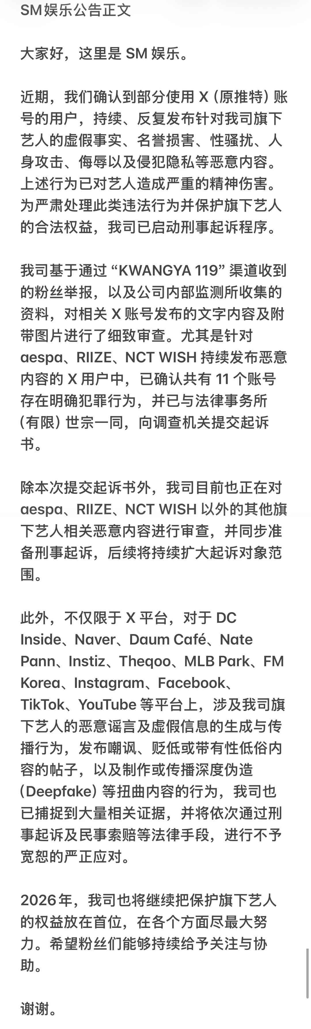 SM娱乐:已起诉针对aespa、RIIZE等恶评账号20日,SM娱乐通过官方渠道发布公告,说明已针对部分在X等社交平台上,持续发布针对旗下艺人的虚假事实、名誉损害、性骚扰、人身攻击及侵犯隐私内容的账号,正式进行刑事起诉。公告中提到,涉及 aespa、RIIZE、NCT WISH 的恶意内容账号中,已有11个账号被确认存在违法行为,并已向调查机关提交起诉材料。SM方面同时表示,后续将对其他艺人相关恶意内容继续审查,并扩大起诉对象。此外,SM也表示已在多个平台收集相关证据,未来将通过刑事起诉及民事索赔等方式,持续进行法律应对。
