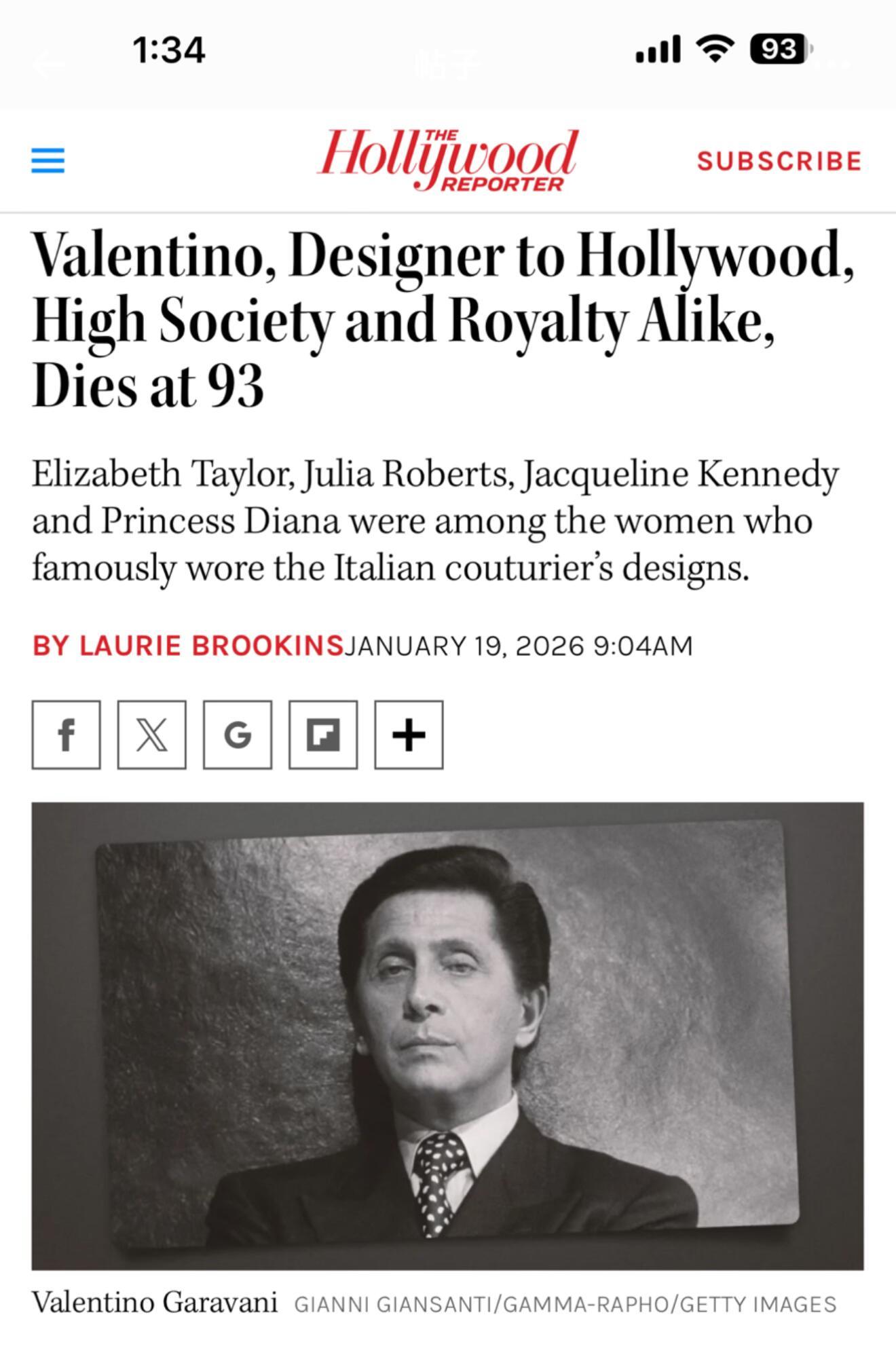 华伦天奴去世意大利传奇时装设计师瓦伦蒂诺·加拉瓦尼(Valentino Garavani)在其罗马家中去世,享年93岁。🕯️