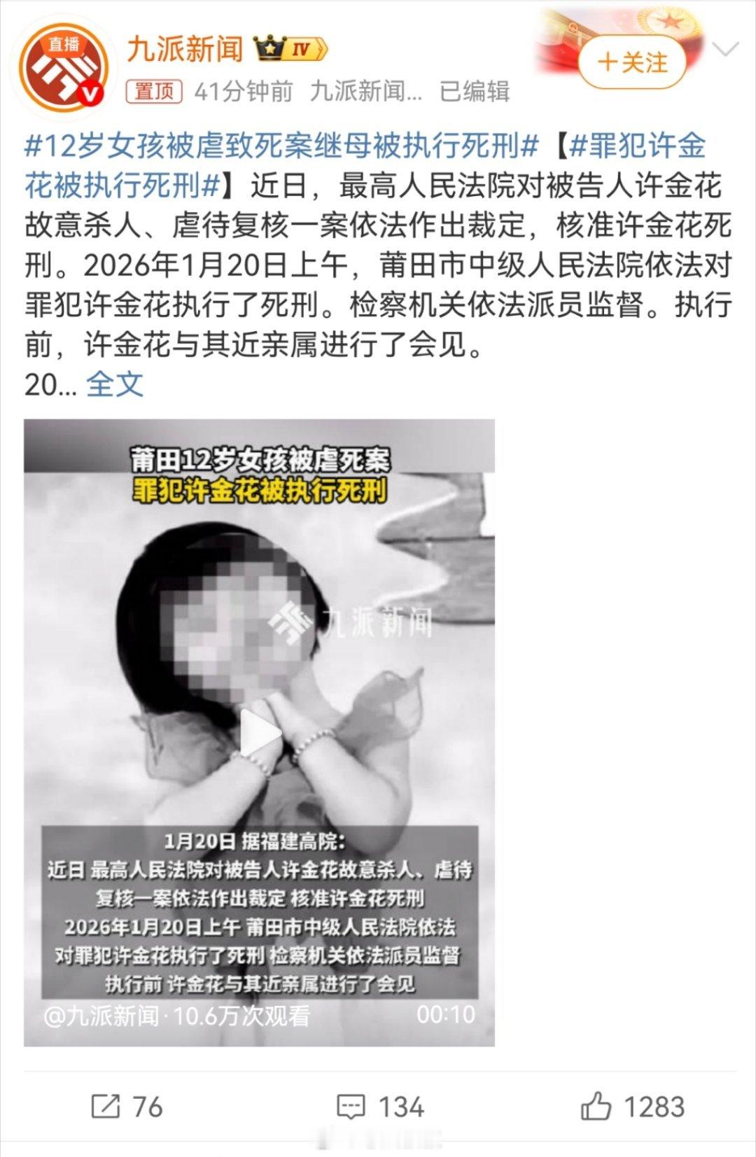 12岁女孩被虐致死案继母被执行死刑继母被执行死刑,实话说也是便宜了她。像这种冷血无情的女人,对一个小女孩下得去这样的毒手,死十回都不过分。还有就是,我觉得生父被判5年多,着实有点判轻了 广州