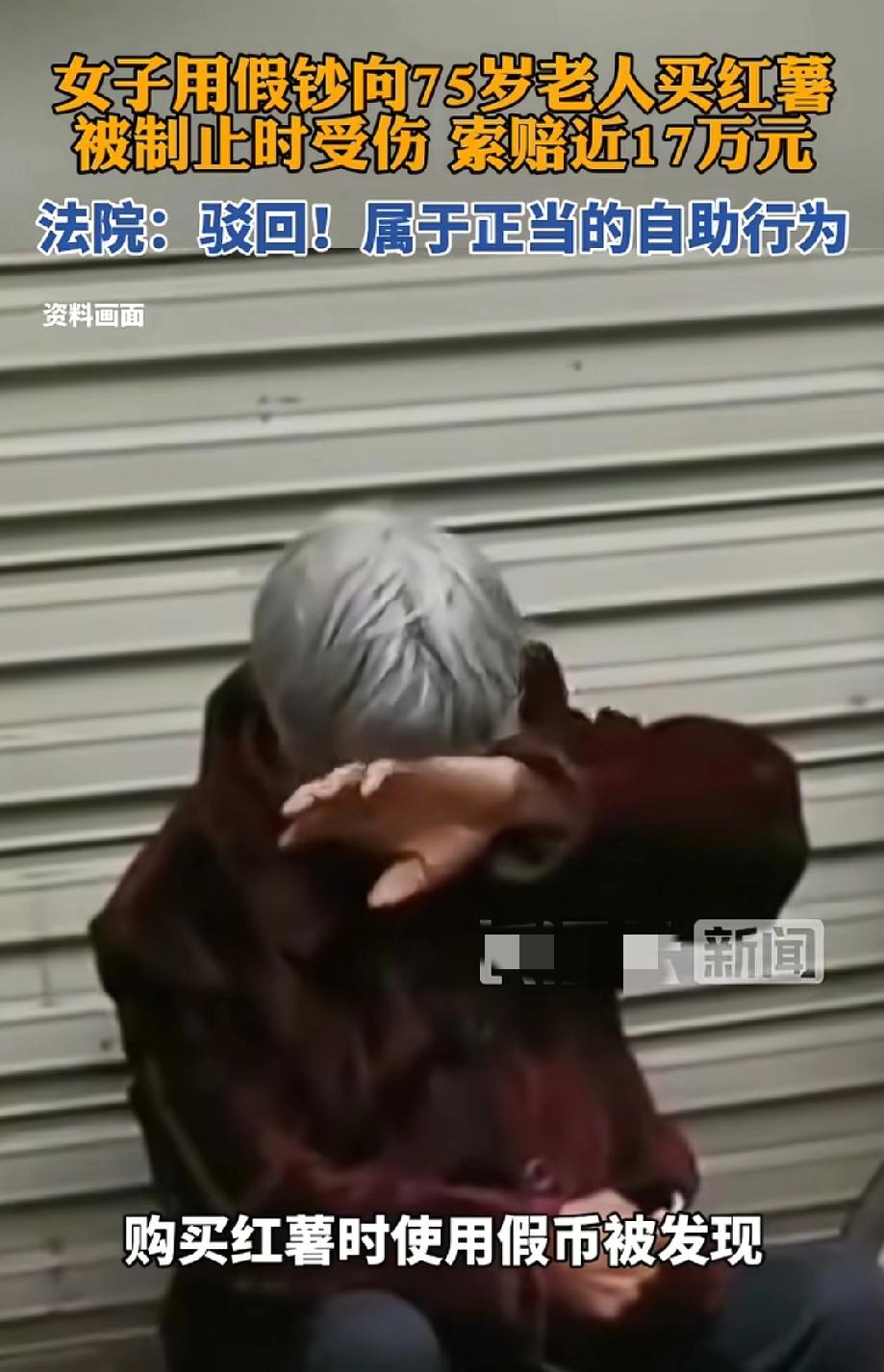 用假钞坑老人, 反咬索赔17万, 法院一句话让她闭嘴! 一个女子拿假钞骗75岁卖红薯的老人,被发现后自己受伤,居然反过来告老人,要17万赔偿! 法院直接驳回:法不能向不法让步! 这种人真的是坏透了!骗老人的血汗钱就算了,被抓现行还想讹钱,脸皮比城墙还厚! 还好法院没惯着,这波判决大快人心!