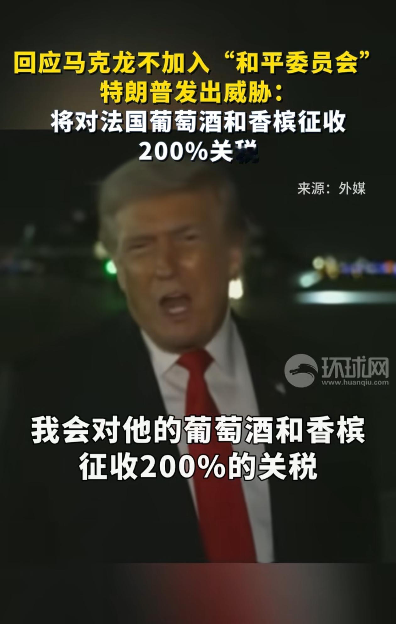 马克龙拒绝加入“和平委员会”特朗普立即报复,他说“没有人想让他加入,因为他马上就要下台了”,同时威胁对法国葡萄酒和香槟征收200%的关税。老特的性格就是“不服就干”,说翻脸就翻脸,七八十岁的人了,就和小孩过家家一样,动不动就“我不跟你玩了”。