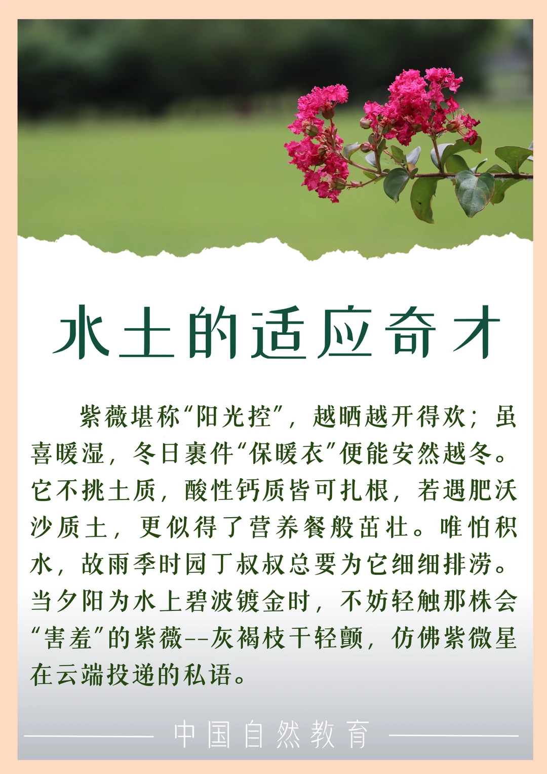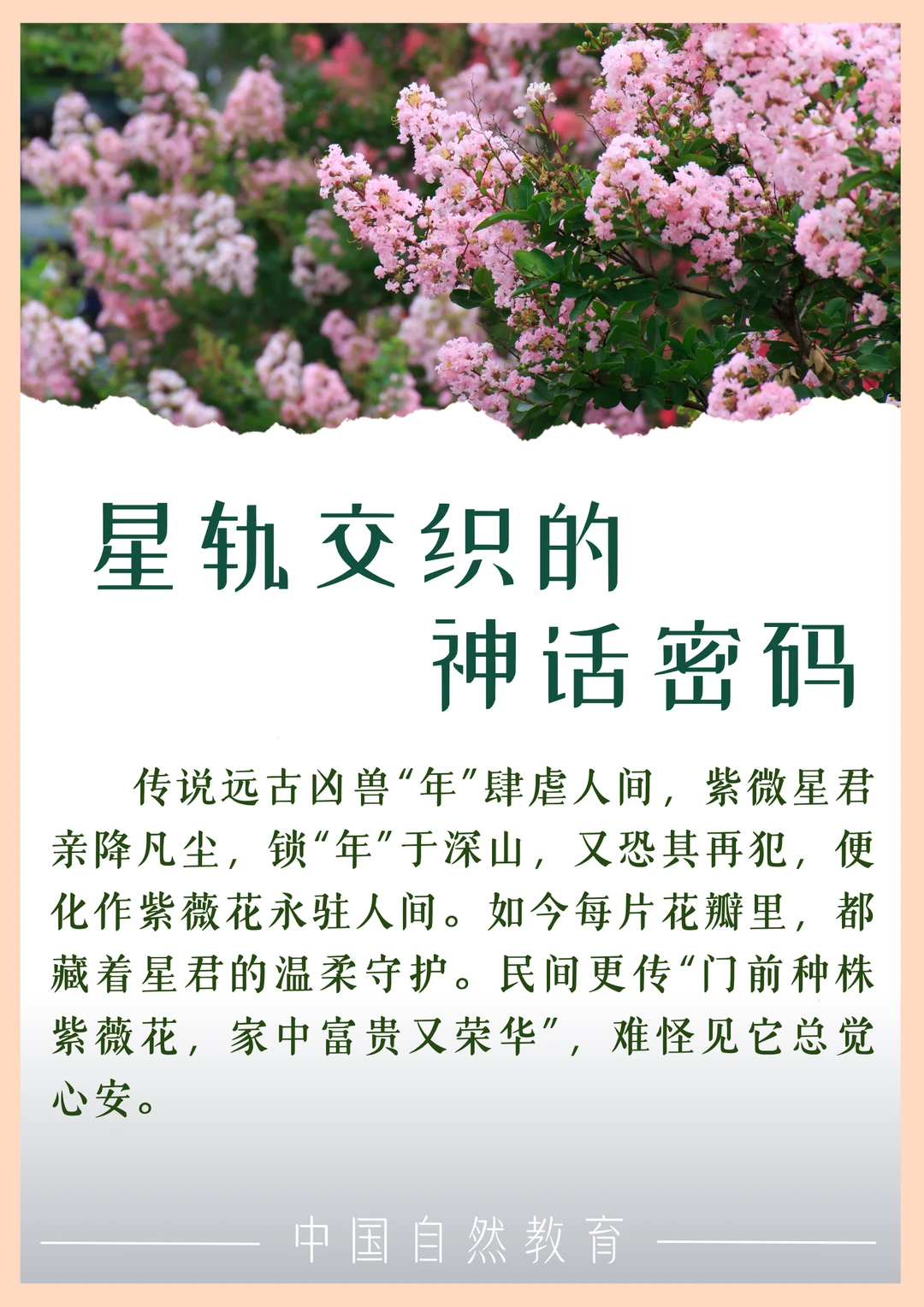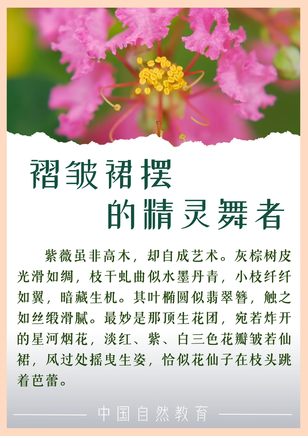 紫薇虽非高木,却自成艺术。灰棕树皮光滑如绸,枝干虬曲似水墨丹青,小枝纤纤如翼,暗藏生机。其叶椭圆似翡翠簪,触之如丝缎滑腻。最妙是那顶生花团,宛若炸开的星河烟花,淡红,紫,白三色花瓣皱若仙裙,风过处摇曳生姿,恰似花仙子在枝头跳着芭蕾。
