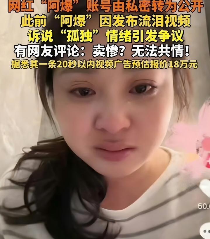 太无语了! 22岁,月入50万+,却和网友哭诉自己“孤独”,这是什么天大的笑话。 果然,杨幂那句“你凭什么让别人了解你的辛苦”含金量还在上升。 1月18日,网红阿爆在网上发视频,哭诉自己“感觉孤独”。 视频中,她一面流泪,一面哭诉,看起来好不痛苦。 然而,眼尖的网友却发现, 阿爆身上穿的是LV睡衣,戴的是宝格丽项链,背后更是自建别墅和东方明珠景观。 随便拿出一样,都是普通人消费不起的存在。 她却轻轻松松的就得到了。 还有她的视频广告。 据第三方数据显示,一条广告就报价18万到24万,是很多普通人一年都赚不到的金额。 有车有房,有钱有闲, 就这样,还在网上说“孤独”,真不知道她哪来的脸? 有多少人想要穿着LV的衣服、戴宝格丽首饰,背靠东方明珠说“好孤独”都没有机会,她却坐在别墅里哭诉。 这就是典型的“哭式炫富”。 要我说,对这样的人,就秉承一个原则:不看、不关注、不评论。 当她热度不在,她还会哭着喊“孤独”吗?
