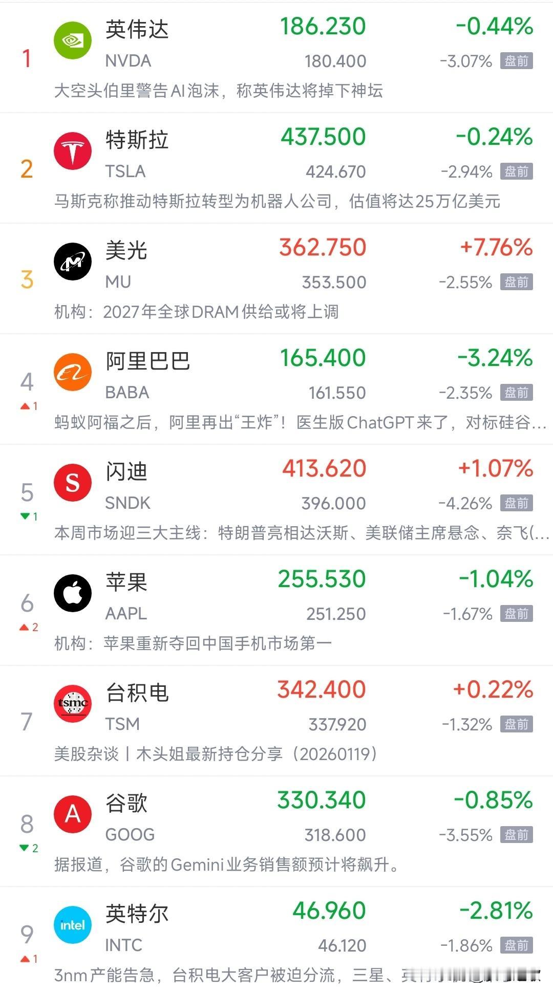 特朗普又搞事情,美股开盘前断崖式下跌 特朗普因为格林兰岛要给欧洲8国加关税,导致美股和欧洲股市全部断崖式下跌,最让投资者难受的是特朗普的关税大棒还在持续发酵当中。 美股盘前三大指数期货全线暴跌,纳斯达克指数期货更是暴跌2.20%,英伟达下跌超过3.07%,微软下跌1.67%,谷歌下跌3.55%。大型科技股全面都在下跌。 今天A股也受到了影响,但是今天的A股又拉上来了,情绪上面就已经过去,不过今天如果美股科技股大跌依然会影响明天A股的科技股开盘。