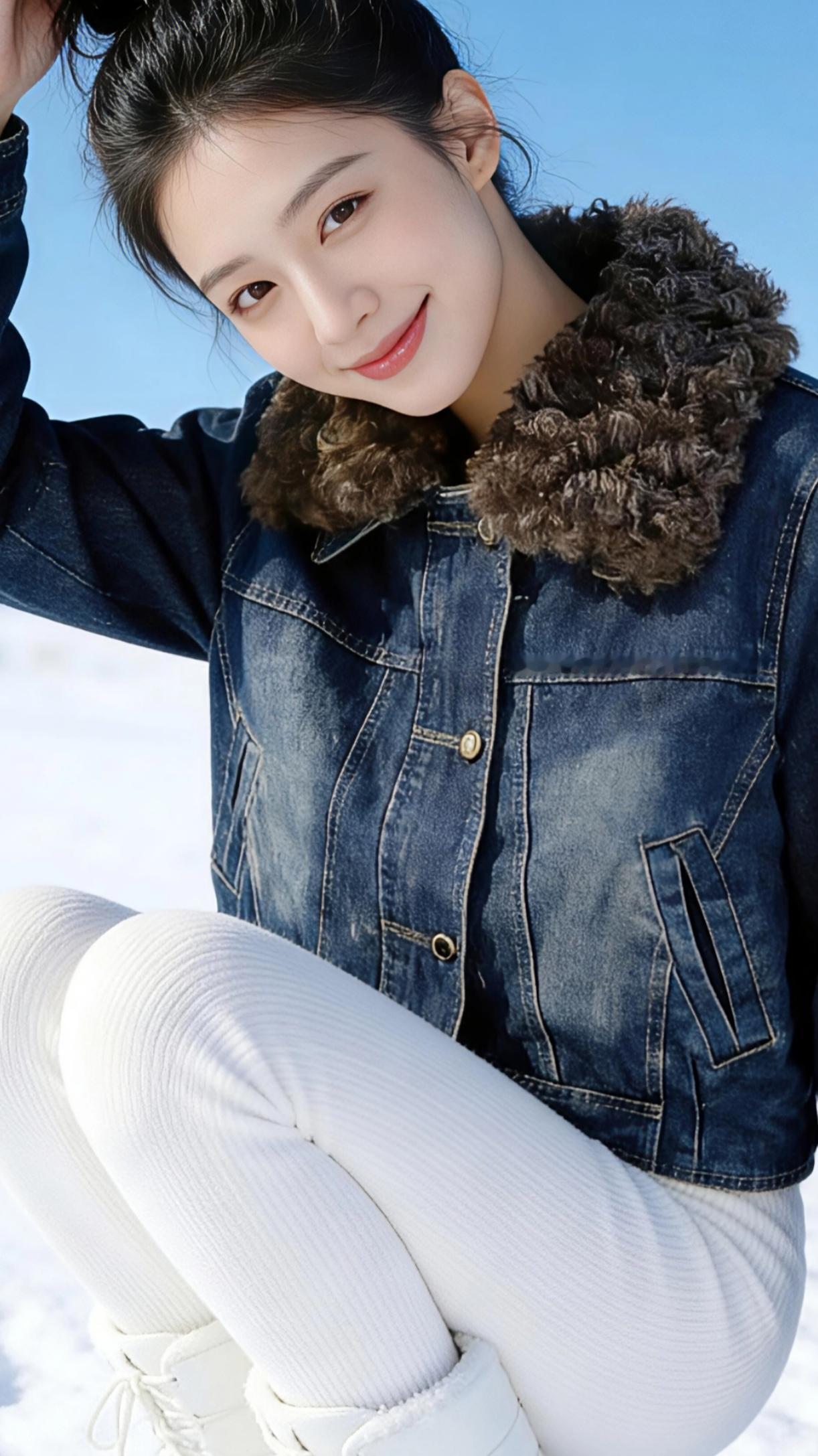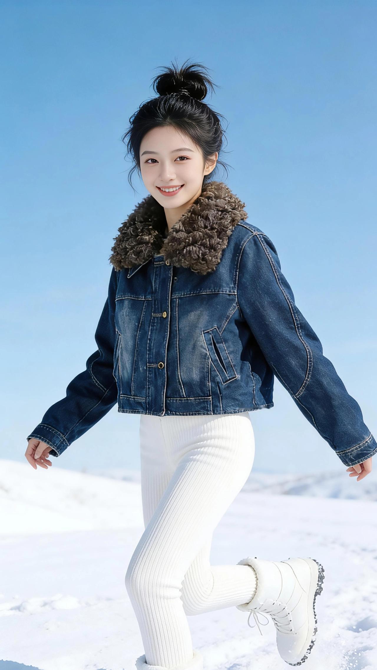 雪野晴光 雪把世界铺成一张干净的纸,天空是最澄澈的蓝,像被风揉皱又熨平的蓝丝绒。 我把头发挽成蓬松的圆髻,像顶着一团沾了雪的云。牛仔外套的毛领圈住脖子,粗粝的绒毛蹭着脸颊,混着阳光晒过的暖意。深色牛仔布料在雪地里像一块浸了墨的棉,被风掀起边角,露出里面米白的针织内搭。 脚步落在雪上,发出细碎的“咯吱”声,像咬开一颗冻梨。白色裤脚扫过雪地,沾了星星点点的雪粒,靴底的纹路在雪面印出整齐的花纹。我忍不住跑起来,风灌进外套的缝隙,带着雪的清冽,吹得围巾贴住脖颈。 蹲下来时,指尖几乎要碰到雪面,阳光在睫毛上投下细碎的影子。远处的雪坡在蓝天里泛着柔和的光,世界安静得只剩下呼吸与风声。原来冬天不必裹紧大衣取暖,也可以像这样,让风穿过衣袖,让阳光落满肩头,在雪地里尽情撒野。 高级感穿搭 冬季穿搭 新年穿搭 棉衣棉服