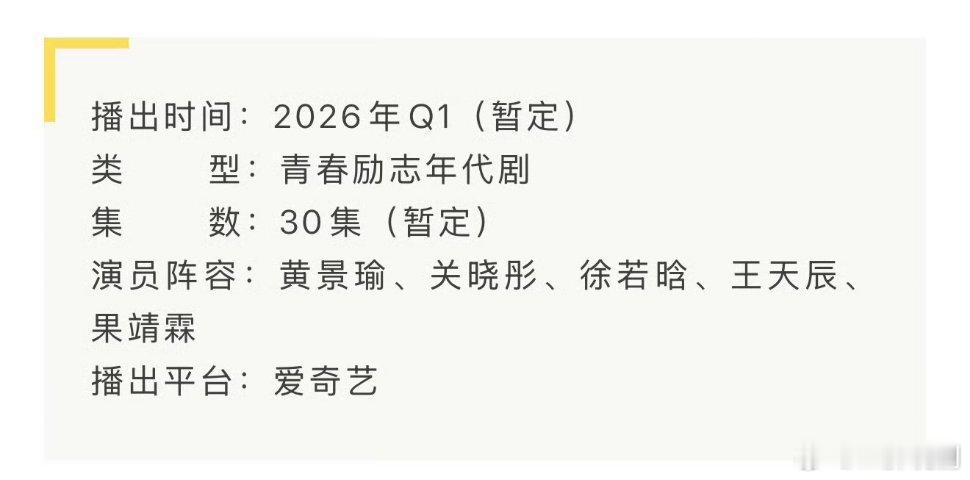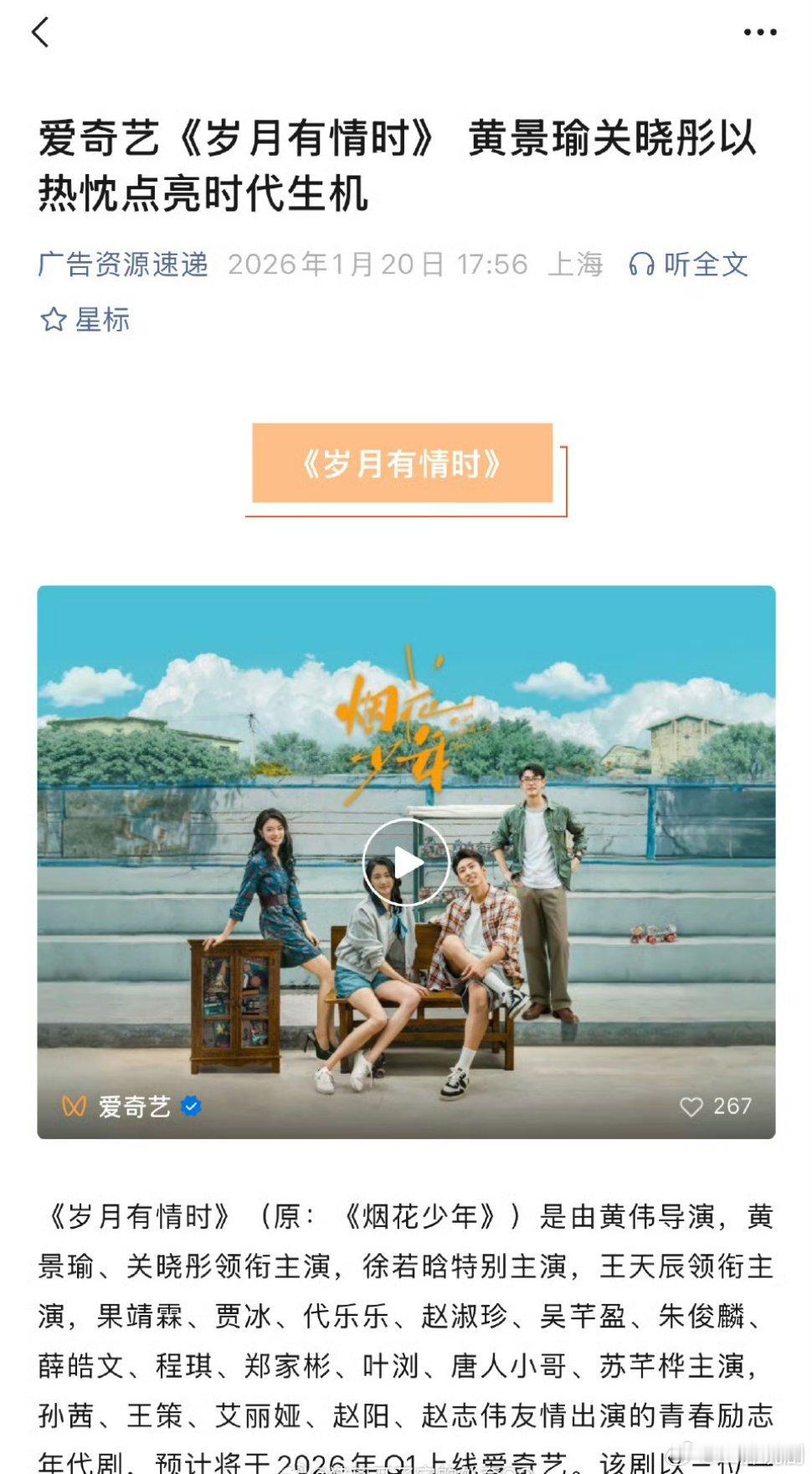 【二胖发布】岁月有情时开启招商 由黄伟导演,卞智弘编剧,黄景瑜、关晓彤、王天辰领衔主演的35集时代情感电视剧《岁月有情时 》正式开启招商,将于春节档CCTV8黄金强档开播,爱奇艺全网独播!