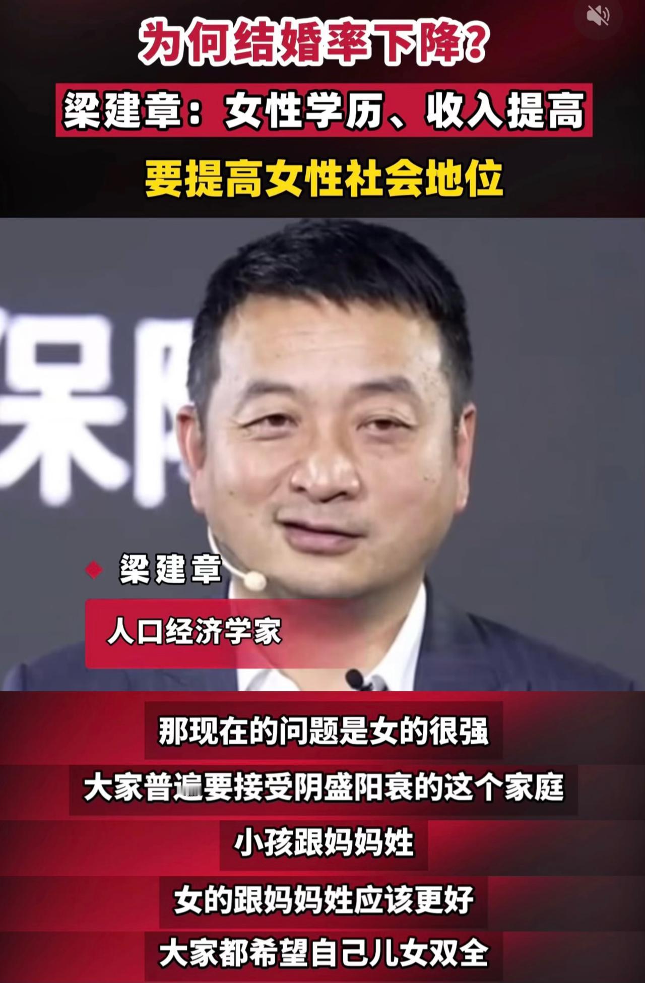为何结婚率下降:女性学历和收入更高 怎么解决:小孩跟妈妈姓,女的跟妈妈姓… 伪专家终于对中国的宗族文化下手了,用的还是国际上最流行的女权逻辑,先抛出结论结婚率低是因为国内女性社会地位不高,再给出方案不但要接受阴盛阳衰还要支持子随母姓,西方政治正确那一套用的很熟练,只是不知道专家对国外女性婚后也要冠夫姓这件事怎么看,是看不见还是不愿意提。