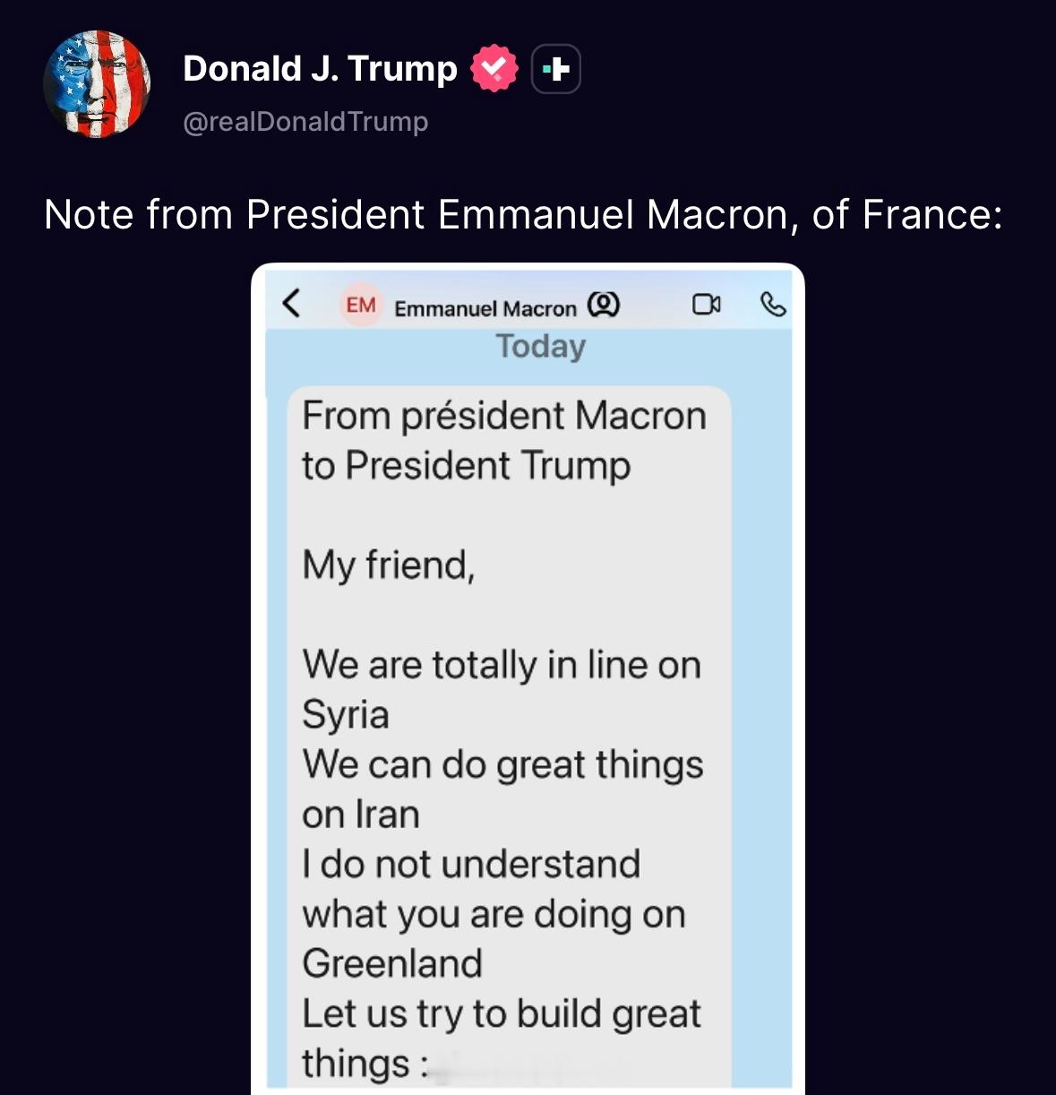 特朗普凌晨发布马克龙短信我的朋友,我们在叙利亚问题上完全一致,在伊朗问题上,我们可以大有作为,但我不明白您在格陵兰岛上的举动。让我们努力成就一番伟业:1)达沃斯论坛结束后,周四下午在巴黎我可以召集一次七国集团会议。我还可以邀请乌克兰、丹麦、叙利亚和俄罗斯在会议间隙参加。2)周四您回美国之前,让我们在巴黎共进晚餐。埃马纽埃尔下午 5 点 01 分热点现场特朗普发登上格陵兰岛图 特朗普回应马克龙拒入和平委员会