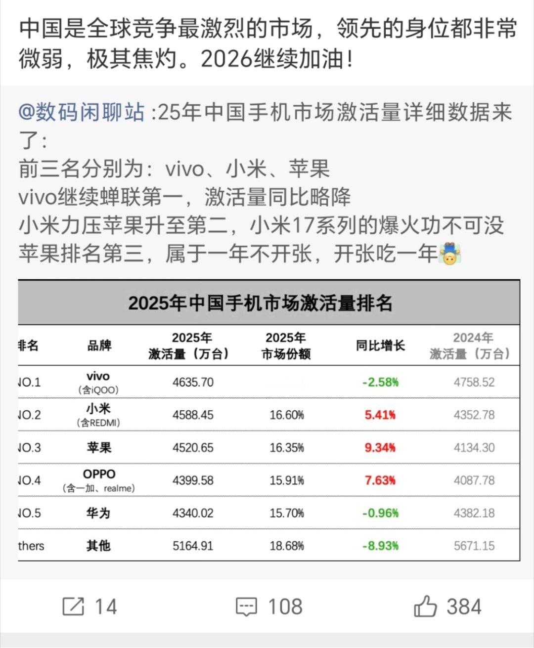 小米超苹果成中国手机激活量第二牛逼啊,小米在国内能超过苹果,这放在以前确实不太敢想,其中红米k80拿下销量第一,看来红米也是功不可没