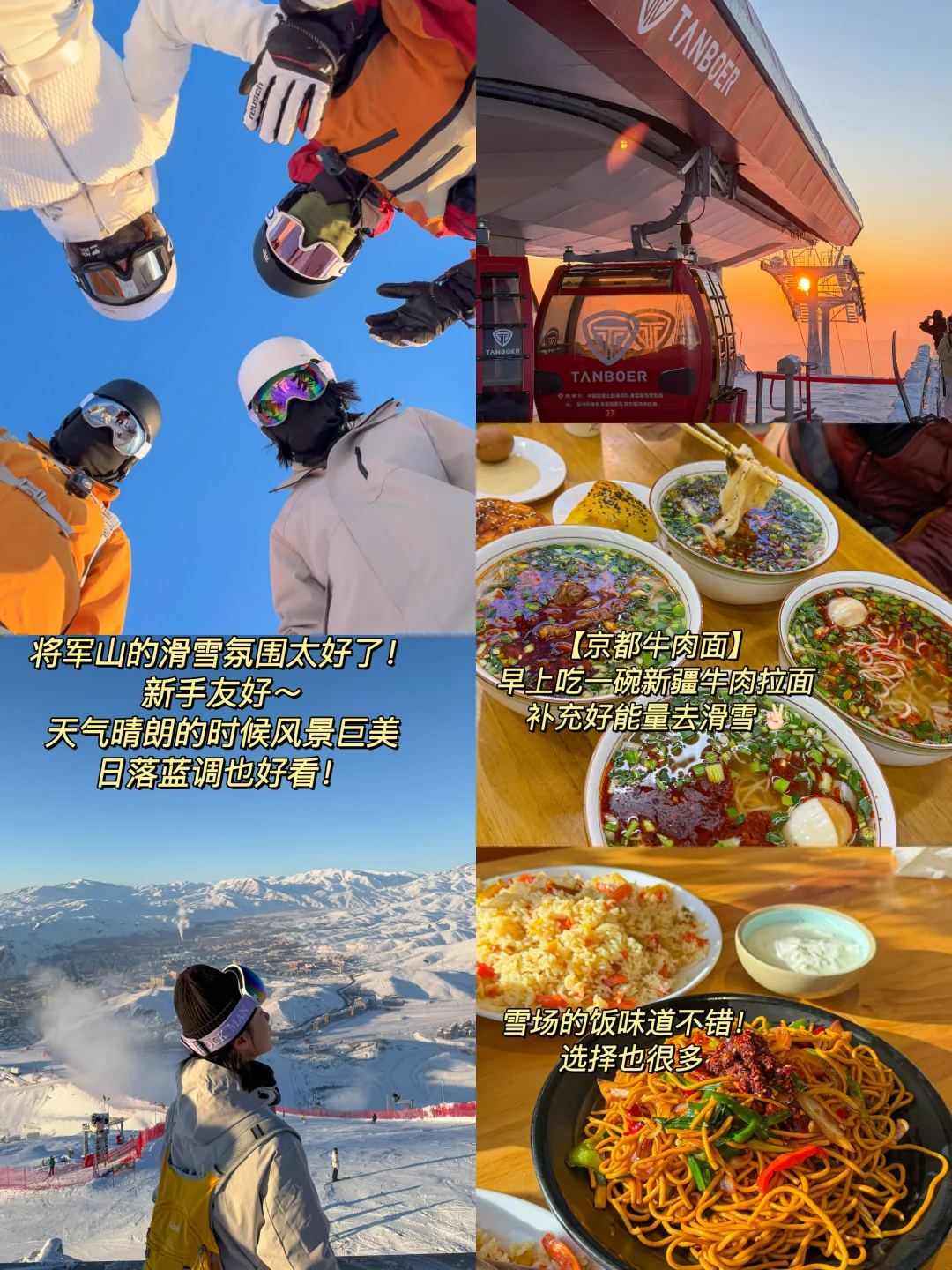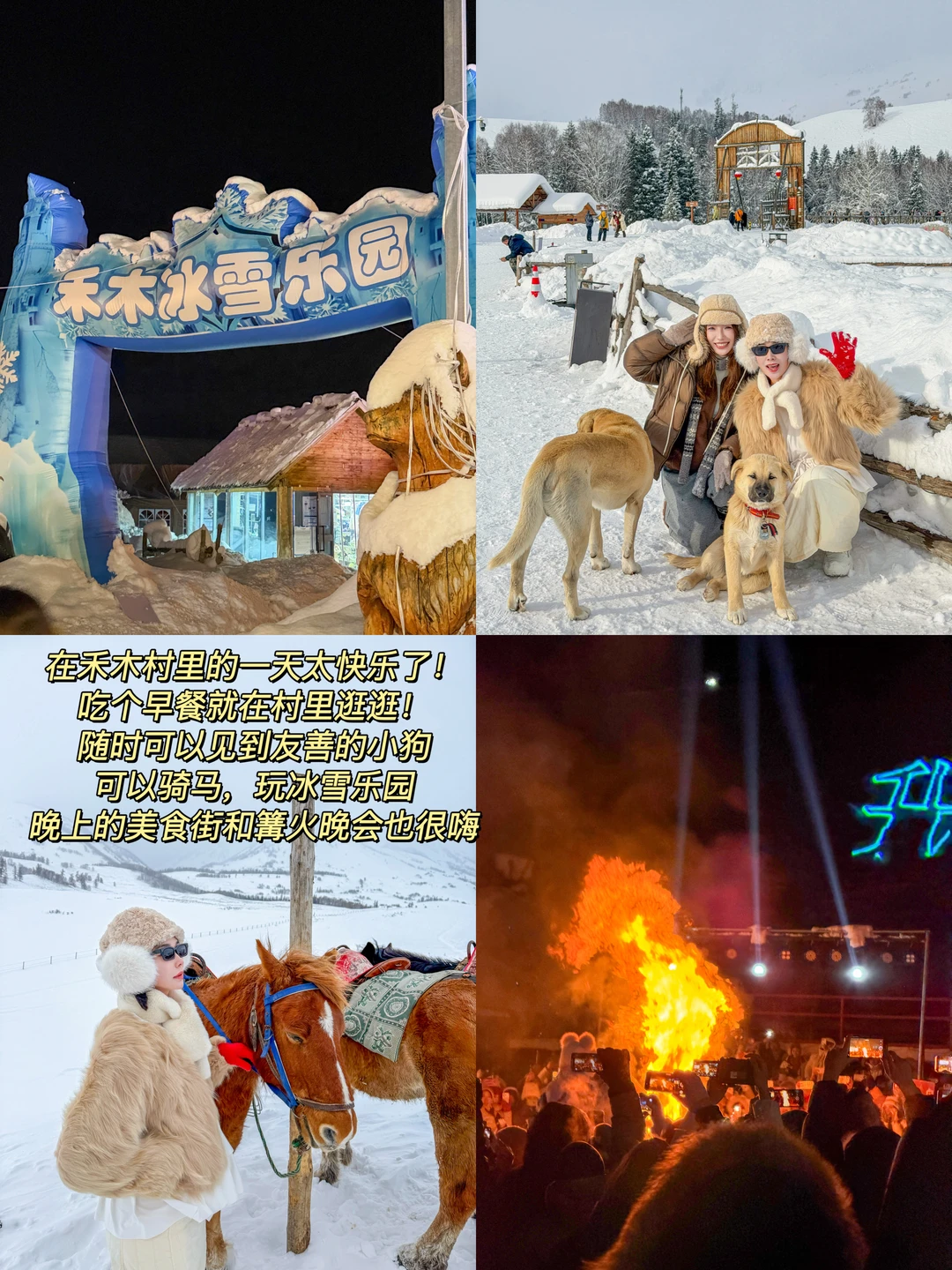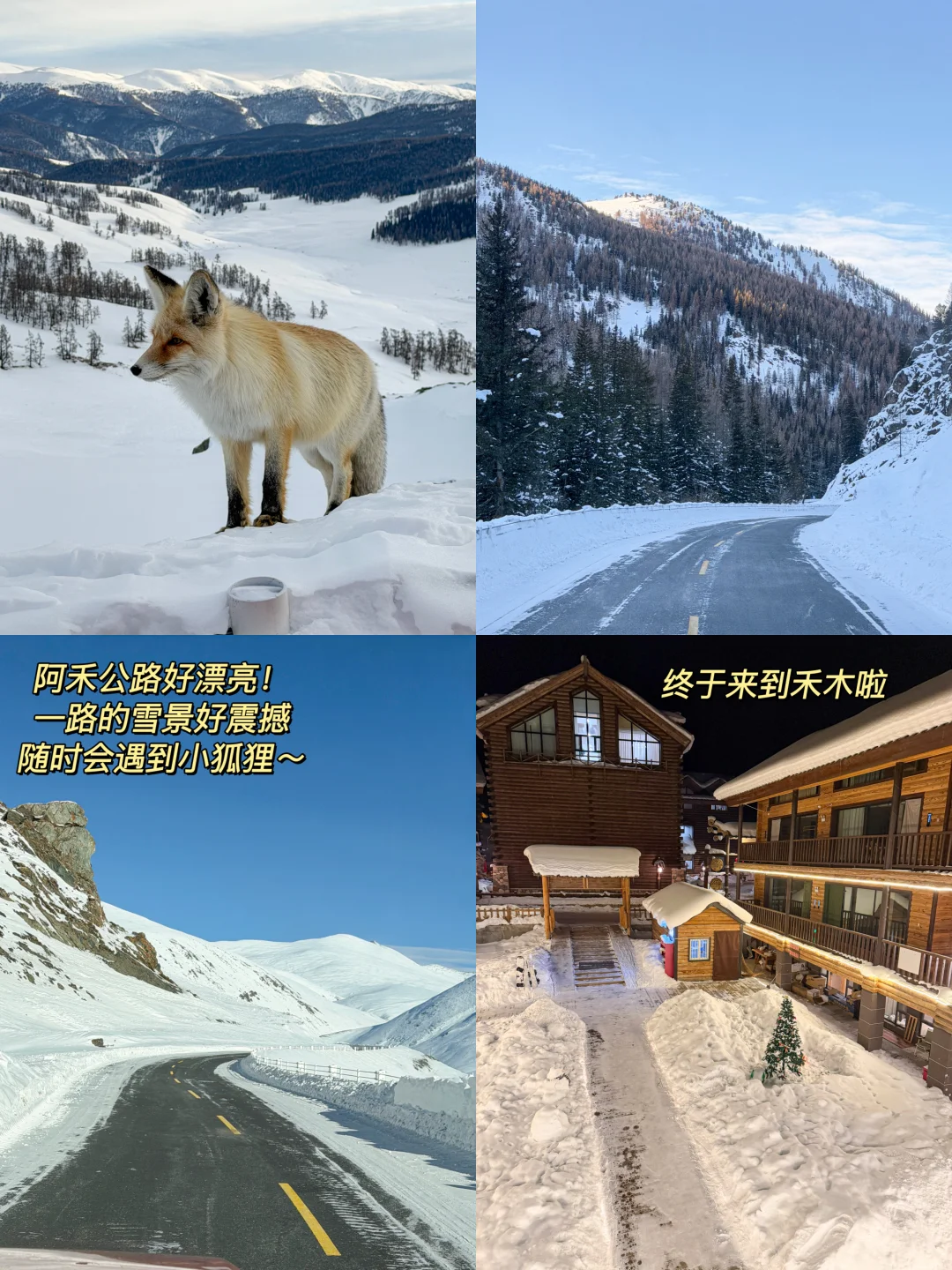 自驾路线: 阿勒泰➡️禾木➡️喀纳斯➡️布尔津➡️阿勒泰 - 🔴D1:上海✈️阿勒泰 🥢晚:「穆沙烧烤」 🔴D2:将军山 滑雪⛷️看日落🌅山顶蹦迪💃 将军山初级道新手友好!中高级道新手慎入👀 山顶蹦迪18:30!很有氛围!!! 提前缆车上山,可以滑下山也可以缆车下山 在山顶可以看日落金山的粉调和日落后的蓝调💙 🔺将军山滑雪场:日场10-19,夜场20-23 (不滑雪的也可以直接缆车上山看日落蹦迪) 🥢早:【京都牛肉面】 🥢中:雪场的新疆饭,味道不错! 🥢晚:【小渔村鱼馆】💃吃饭的时候有表演! 🔴D3:桦林路公园➡️五百里风情街➡️金山市场➡️骆驼峰 🔺【桦林路公园】🆓!有冰上娱乐项目~马拉雪橇,冰上碰碰车,小型电动车 ☕️「喂风山」可以拍照打卡雪景! 门口还有雪地轮胎和雪板可以租了带进去玩! 🔺【五百里风情街】 来逛「阿勒泰的角落旅行书吧」文创好看🤩 🔺【金山市场】 🔺【骆驼峰】 从市场可以步行去骆驼峰 日落前上山,还能看到粉调! 晚上蓝调大约在19:30左右 🥢早午饭:【努尔古力奶茶】 🥢晚:【胡赛大盘鸡】 🔴D4:阿勒泰➡️禾木(走的阿禾公路🚗太美了) 半路有休息站!可以吃点东西 还看到了好多小狐狸🦊好治愈 🥢晚:味云轩,干煸辣子鸡巨好吃😋 🔴D5:吉克普林滑雪场 雪质好粉!新手可滑✌🏻雪场吃的也很多 【西区】初级道【东区】中高级道 🥢晚:繁花里(新疆土火锅好吃,烧烤一般! 🔴D6:禾木村 可以去禾木桥和援疆桥打卡拍照! 村里的🐶好友善!🐎禾木骑马体验不错!好多路线可以选!路线都挺长的~ 冰雪游乐园和篝火晚会都在美食街 🥢早午饭:粉面店 🥢晚:七里湘 🔴D7:禾木➡️喀纳斯➡️贾登峪(住) ✅可打卡:喀纳斯老桥,神仙湾(可骑马🐎),小湖检查站,泰加林之王 🥢早:葡萄树 🥢午:塞外味道 🥢晚:疆上鲜 🔴D8:贾登峪➡️布尔津➡️阿勒泰 贾登峪出发两个多小时可以到布尔津 打卡布尔津大桥📷和「小牛克恩」 🥢早午饭:米泉(吃冷水鱼) 🥢晚:胡赛大盘鸡 🔴D9:阿勒泰✈️上海 - ⚠️关于吃:P16-18