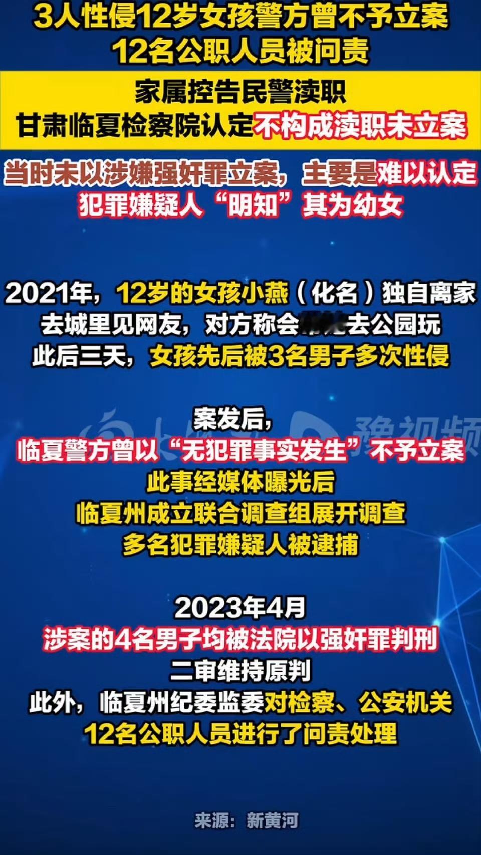 一场迟到四年的正义,一个难以愈合的伤口!3人性侵12岁女孩警方不予立案…… 2021年盛夏,甘肃临夏12岁的肢体残疾女孩小燕(化名),因一次离家见网友的决定,坠入了万劫不复的深渊——她被3名男子多次性侵,而本应守护正义的执法机关,却在3天内草草作出“无犯罪事实发生”的不予立案决定。 直至媒体曝光引发舆论海啸,这场被漠视的侵害才得以重审,最终4名施暴者获刑6至15年,12名公职人员被问责。但当2025年12月甘肃省检察院维持对办案民警的渎职不立案决定时,不禁让人愤慨:迟到的正义虽到,可那个破碎的生命、暴露的制度漏洞,真的得到了弥补吗? 根据《刑法》第236条及四部门关于惩治性侵害未成年人犯罪的意见,奸淫不满14周岁幼女的,无论是否“明知”年龄,均构成强奸罪,其中不满12周岁的被害人更是直接推定行为人“明知”。而临夏警方初期却以“难以证明嫌疑人明知小燕未满14岁”为由不予立案,完全背离了“最有利于未成年人”的司法原则。 更令人痛心的是,警方调查存在明显疏漏:未提取关键手机数据、忽略受害者身上的反抗伤痕,这种粗放的执法不仅让施暴者险些逃脱制裁,更让小燕错失了及时的心理干预时机。 尽管后续司法纠正了这一偏差,施暴者依法获刑,但家属对办案民警(时任刑侦副大队长马某等)的渎职控告,最终因“非个人主观故意”“未达渎职罪标准”被驳回。检方的理由看似符合法律条文,当《未成年人保护法》明确要求国家机关“立即受理、处置”侵害未成年人的控告时,3天草率结案、关键证据遗漏的行为,难道仅仅是“工作疏漏”? 比起施暴者的刑期,小燕的现状更让人揪心。案发四年来,这个本该在校园里无忧成长的女孩,始终被创伤与歧视包裹:多次自杀未遂(喝农药、割腕),被确诊重度抑郁需长期服药;在校期间遭受“怀过孕”的恶意造谣与霸凌,2025年11月被迫休学;而她的家庭早已支离破碎,生母失踪、父亲精神残疾,只能依靠叔叔马建强艰难抚养。 《未成年人保护法》规定,未成年人遭受侵害后应获得及时的心理干预与社会救助,但小燕却在长达四年的时间里独自承受创伤。这种保护缺位并非个例,类似山东HPV感染案暴露出的强制报告制度失效,让许多未成年受害者在沉默中被二次伤害——学校未察觉异常,医疗机构未主动报告,本应织密的保护网,在基层却出现了致命的缝隙。 更值得反思的是基层执法对法律条文的僵化理解。四部门意见明确规定,对于已满12周岁不满14周岁的被害人,可通过“身体发育状况、衣着特征”等推定行为人“明知”年龄,小燕12岁4个月的年龄、肢体残疾的特征,本应成为关键依据,却被警方忽视。这背后,是“最有利于未成年人”原则在基层执法中的弱化,是对未成年人特殊、优先保护的制度要求落实不力。 临夏案给我们留下的,不应只有愤怒与惋惜,更应是对未成年人保护体系的深刻重构。 《未成年人保护法》第一条便开宗明义:“保护未成年人身心健康,保障未成年人合法权益”。当执法者坚守底线、制度衔接无隙、社会形成合力,才能让每一个孩子都不必在黑暗中独自哭泣,让“最有利于未成年人”不再是一句口号,而是触手可及的安全感。 愿小燕的遭遇成为最后一例被漠视的侵害,愿所有未成年人都能在法律的庇护下,自由、安全地长大。