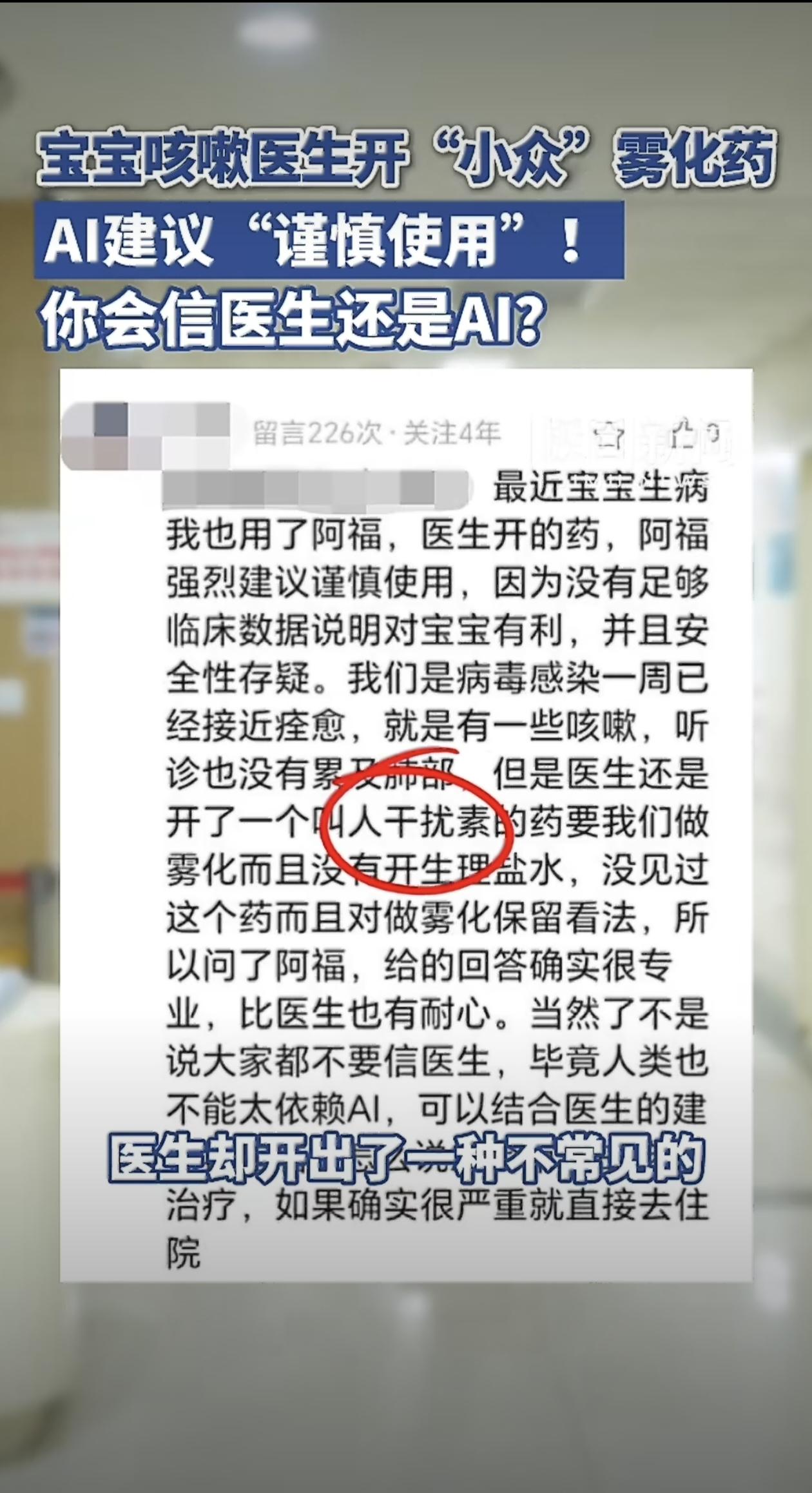 一位宝妈陈女士的经历在网上引发了热议。她一岁多的宝宝感冒快好了,只剩下轻微咳嗽,带去医院复查时,医生开了一款叫“人干扰素”的雾化药,而且没有搭配生理盐水稀释。陈女士心里直犯嘀咕:这药安全吗?适合这么小的宝宝吗? 带着满心疑虑,陈女士回家后赶紧用健康AI工具“蚂蚁阿福”查询。输入宝宝的症状、年龄和药物名称后,AI的回复让她更纠结了:“建议谨慎使用该药物。目前针对儿童的临床数据有限,安全性尚未完全明确;结合宝宝症状较轻,可优先考虑居家护理观察,或选用更常见的替代药物。”AI还详细解释了药物作用机制、适用场景和潜在风险,甚至列出了替代方案。这下陈女士彻底拿不定主意了,一边是三甲医院的专业处方,一边是详细的AI风险提示,到底该听谁的? 类似的情况其实不少见。记者随机采访了几位家长,发现大家的选择各不相同。武汉有位宝妈说,如果孩子病情不严重,她会谨慎对待陌生药物,更倾向于听AI的居家护理建议;新手奶爸张先生则表示:“我更信任医生,但会用AI查细节,比如雾化操作注意事项、拍背排痰技巧,这些AI讲得很清楚,让我更敢动手。”还有位宝妈和陈女士一样,带着医生的处方和AI建议,又找另一位相熟的儿科医生咨询,对方结合宝宝具体情况,也建议“症状轻先观察,加重再复诊”。 不过,长辈们的态度普遍更传统。退休的刘奶奶直言:“我只信医生!医生能摸到孩子的脉搏、听到肺部声音,这些是实打实的诊断,AI比不了。”但她也承认,AI普及基础用药知识,能缓解家长的焦虑,“这点挺好的”。 为什么家长们会如此纠结?本质上是“信息差”带来的不安全感。医疗资源紧张,医生问诊时间有限,家长对健康信息的需求又极高,AI恰好成了弥补差距的“缓冲带”。湖北省中医院儿科资深护师刘女士说:“现在家长主动用AI查信息,说明对孩子的健康更重视了,这是好事,但关键要把握‘参考边界’。”医生开处方是综合判断的结果,除了症状,还要考虑孩子年龄、过敏史、既往病史,以及面诊时的精神状态和听诊结果,这些是AI无法完全替代的。 湖北省中西医结合医院副主任医师孙俊给出了实用建议:把AI当“信息补充工具”,遇到陌生药物时用它梳理疑问,避免盲目用药;把医生当“决策核心”,带着AI的疑问找医生解答,最终治疗方案以医生建议为准;急症千万别依赖AI,高烧不退、呼吸困难等情况必须立即就医,别因纠结建议耽误治疗。 这场“医生VS AI”的用药抉择,没有绝对的对错。AI是工具,医生是核心,两者结合才能让家长更安心。毕竟,孩子的健康,容不得半点马虎。来源:极目新闻