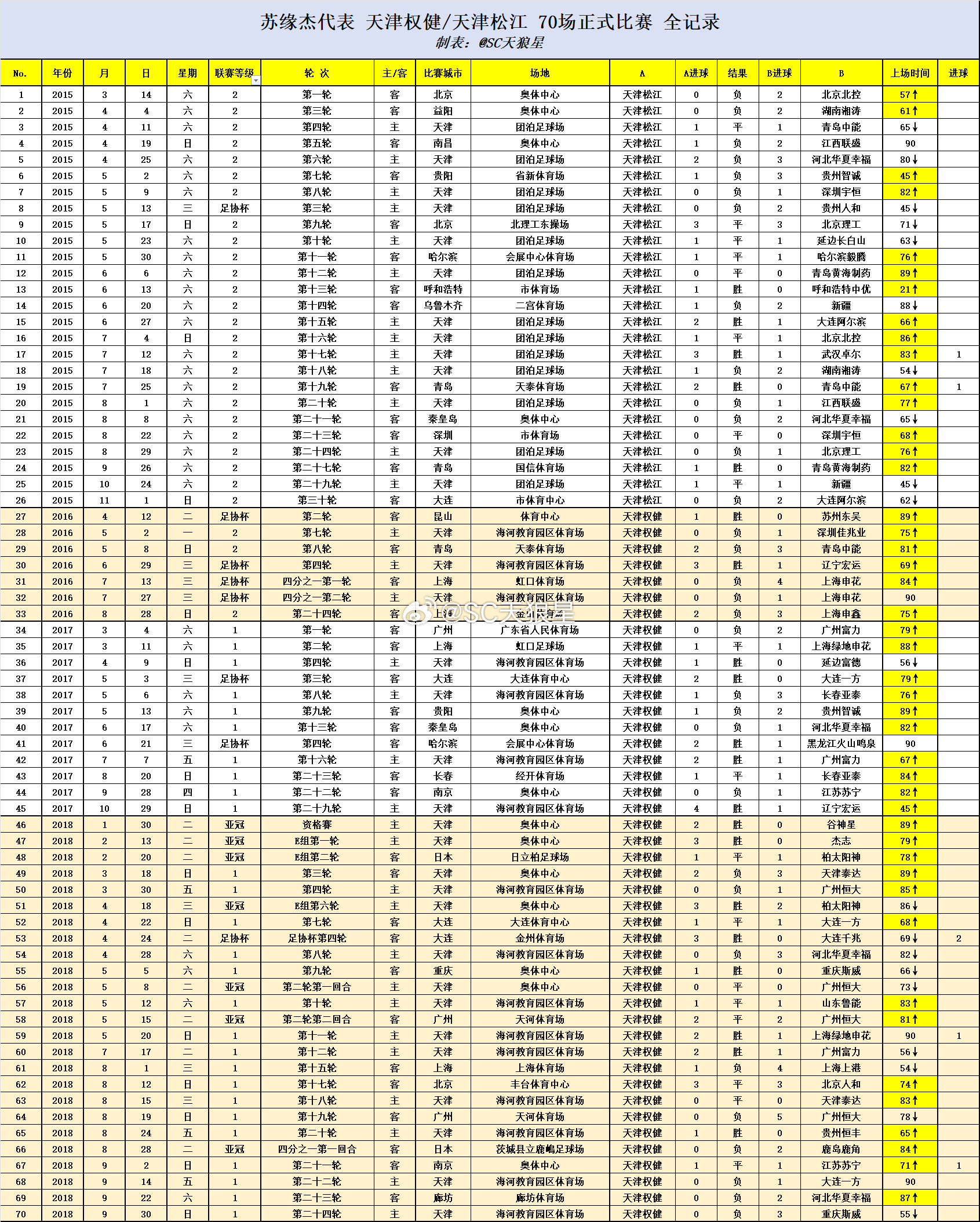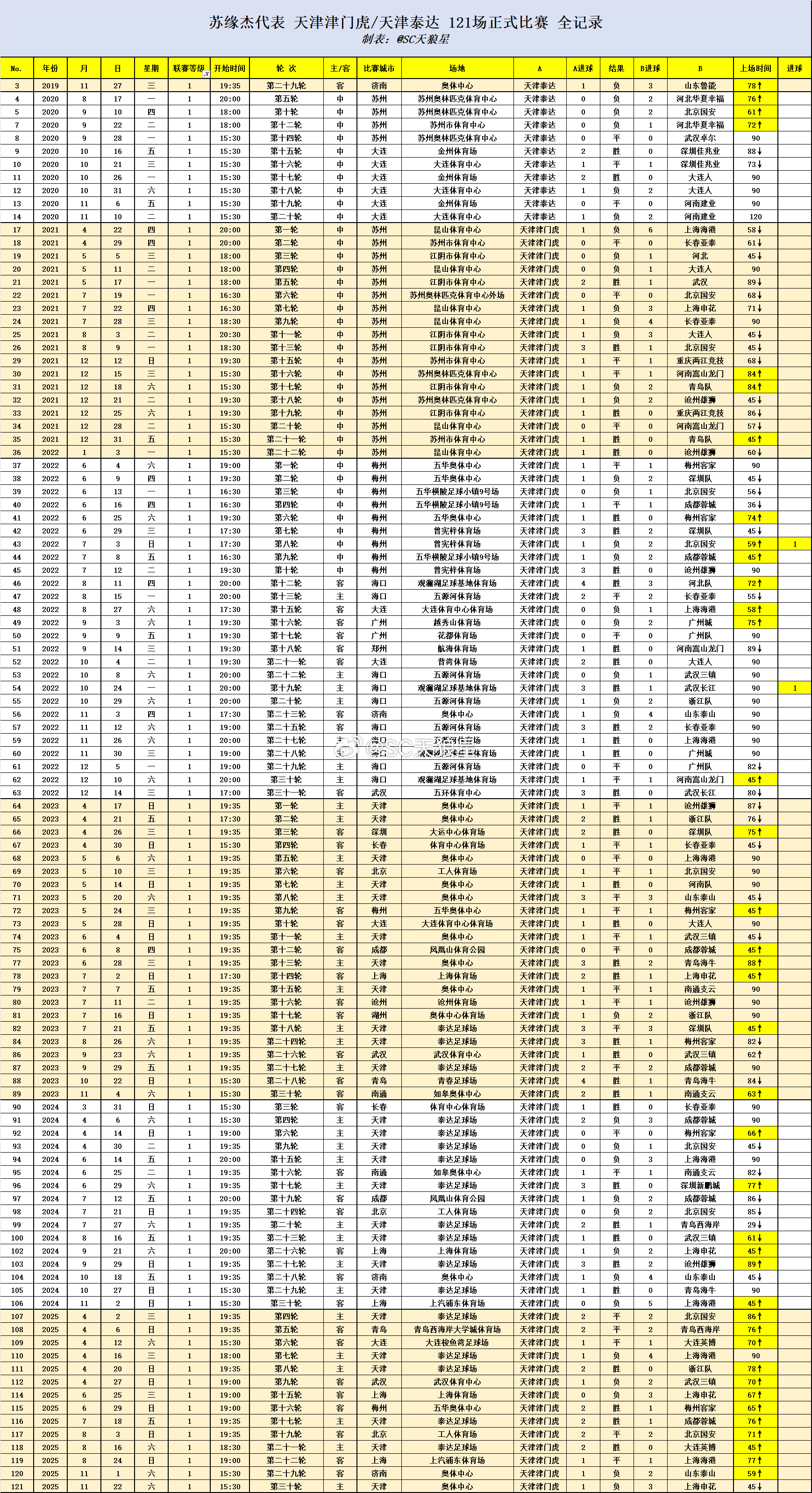 2014年下半年,从葡萄牙回到天津,2026年年初正式告别天津。职业生涯前12年,都贡献给了天津。2015-2018,代表权健/松江,正式比赛出场70场7球。(中甲28场2球,中超27场2球,足协杯8场3球,亚冠7场0球)这支已经成为历史的球队,队史最快进球纪录,就是来自于苏缘杰、(2018年4月14日,球队足协杯对阵大连千兆,1分钟进球)。2019-2025,代表津门虎/泰达,正式比赛出场121场4球(中超108场2球,足协杯13场2球)2021年,球队改名津门虎之后,球队在正式比赛中第一个梅开二度,就是来自于苏缘杰。(2021足协杯2:0北京北体大)。从蛇年到蛇年,12载就这么流水走过,191场正式比赛,11个进球,就是大康在天津的全部职业生涯。祝未来一切顺利。图1: 在权健/松江 70次出场全记录图2: 在津门虎/泰达 121出场全记录图3: 2015年,苏缘杰代表松江首秀的照片图4: 2025年,苏缘杰代表津门虎的最后一战天津津门虎中超联赛苏缘杰天津津门虎