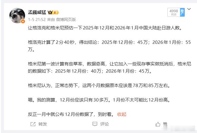 现在20000日元只等于880人民币元。娘的我很长时间没关注的JR PASS,重新关注起来。机场接送也看起来!丰田海狮十座,我一个人霸!!日本政府观光局官方网站还没有更新12月份赴日游人数,但日本新闻里已经报了,因为国土交通大臣今天在记者会上公开了部分数据。中国大陆33万,和我预测的一致(如下)。这也是俺和GEMINI,GROK聊天时间最长的一次。2025年全世界赴日游总数据是4270万人的历史新高。2026年我估计能微升到4400万左右,最差也是基本持平。此消彼长。欧美市场开拓得很有效果。我个人感觉德国迟早会超过法国和英国,成为欧洲赴日第一客源地。意大利是欧洲几个主要国家里今年赴日游涨幅最高的,梅洛尼这次来了后,应该又要开新航线了吧。欧美唯一非常不妙的,但可能也没法改的,就是很多人对东方饮食的普遍敬而远之,造成食材浪费。东京大阪这样的西洋料理鼎盛的地方无所谓,小城市就要吃苦头了。此外,印度和印尼两个人口大国持续激活的迹象也很明显。今年前九个月欧洲增幅(对比去年)36%,北美23%,大洋洲19%;南美41%,非洲53%,当然这两大洲数据还太低, 看个热闹。最终的2025年赴日游整体详细数据将在今年三月中出品。