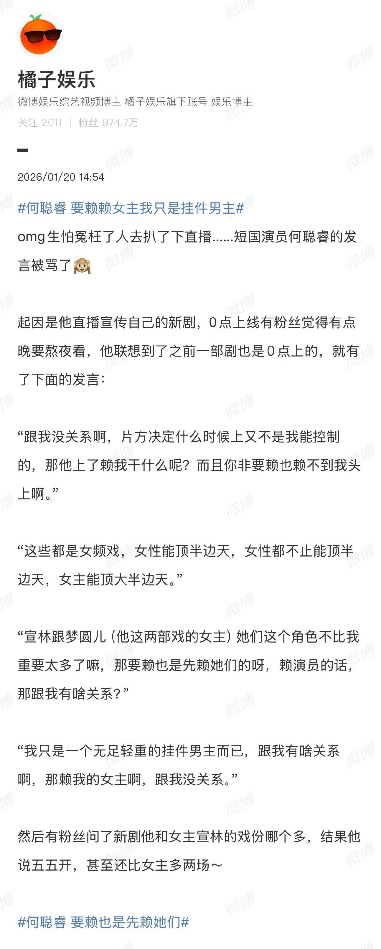 何聪睿为言论不当道歉何聪睿向观众和女主道歉何聪睿为个人言论不当引发舆论道歉了“