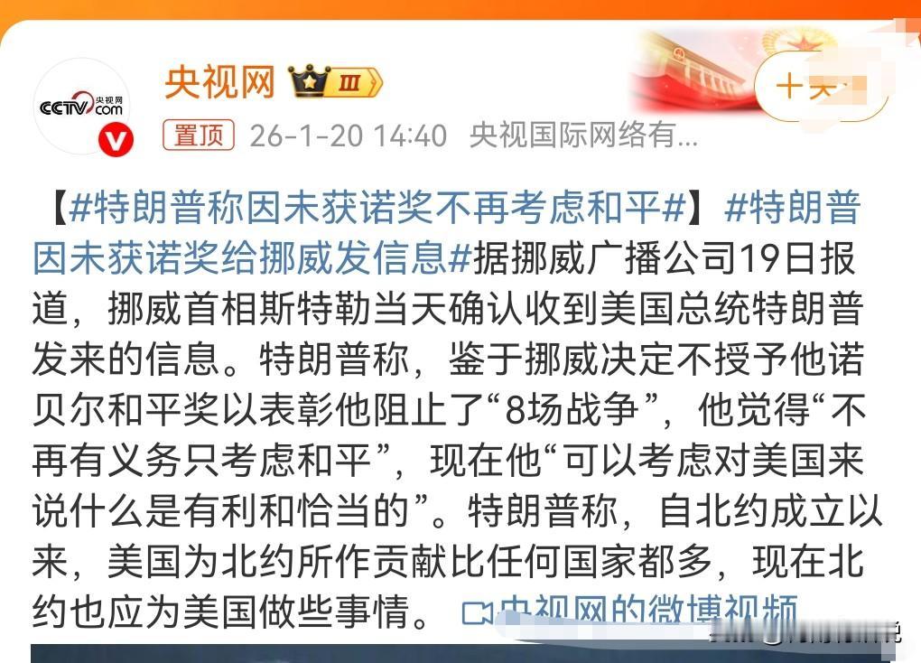 特朗普也太下头了吧。 1月19日报道,特朗普称因未获诺奖不再考虑和平。 特朗普是在搞笑吗?就他也配得诺贝尔和平奖? 真的是太可笑了。一个发动侵略的人竟然想得诺贝尔和平奖。 竟然还好意思说因为没有获得诺贝尔和平奖,所以不再考虑和平。 这实在是太荒唐了。