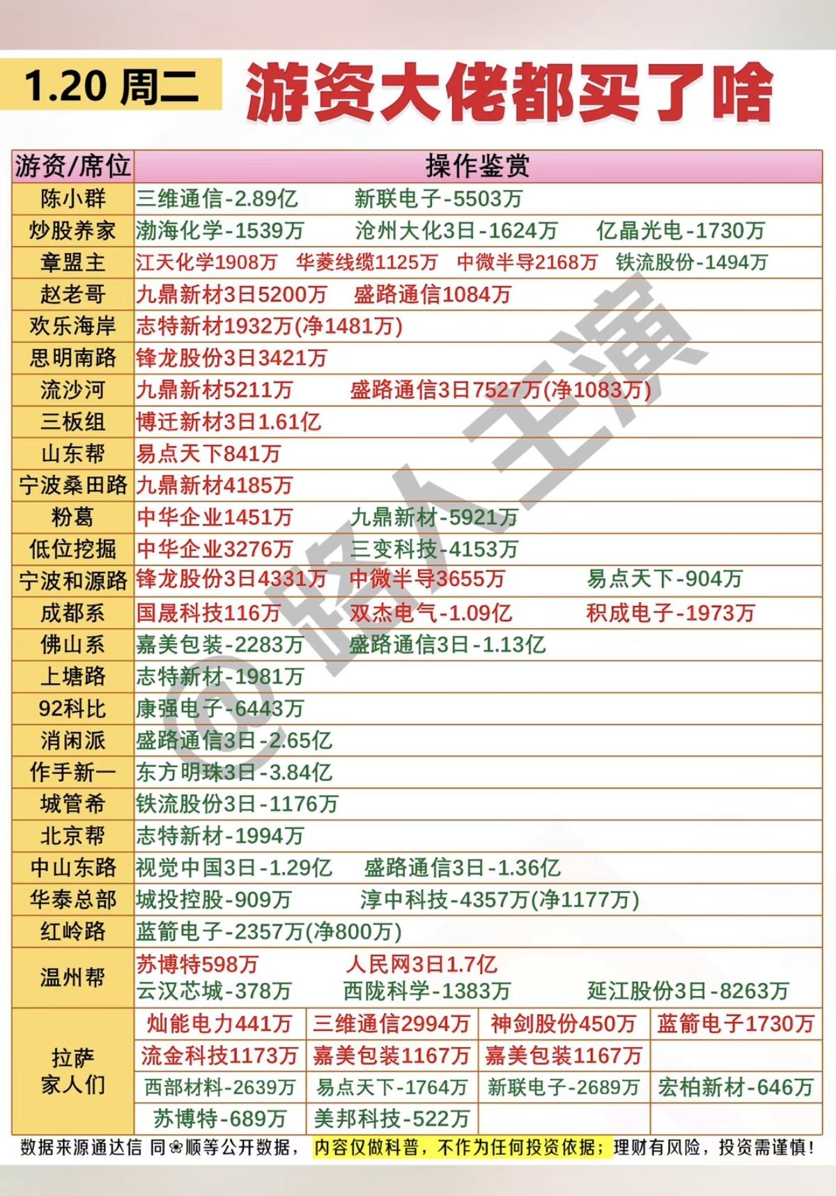 1.20周二 游资大佬抢筹 龙虎榜! 群总,都是在卖股了,没有新买的股! 陈小群 卖出:三维通信新联电子 九鼎新材,锋龙股份,三维通信,盛路通信获多家游资共同抢筹。