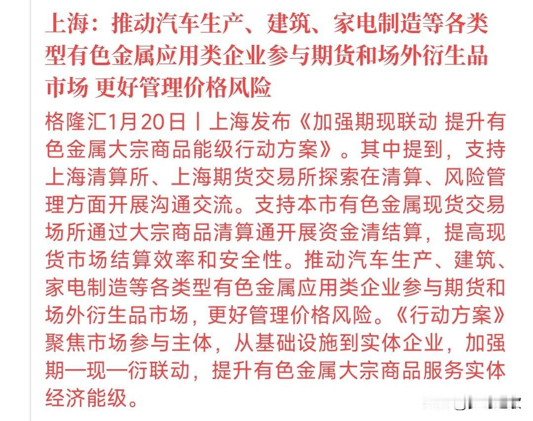 有色金属在A股收盘后迎来利好消息 这个消息主要就是为有色金属下游产业让路,让上游的有色金属原材锁定价格,稳定利润,简单就是上游不要再涨价了,下游制造业才能稳定商品价格。 这对于有色板块来说,目前的价格已经涨得很高了,再涨虽然利润能够再次提高,但对于长远发展并不是一共好的现象。反而现在锁定价格,能够暴证稳定的价格。 对下游制造业来说,像汽车,家电来说也能过减小成本,稳定利润,对上下游都是好事。