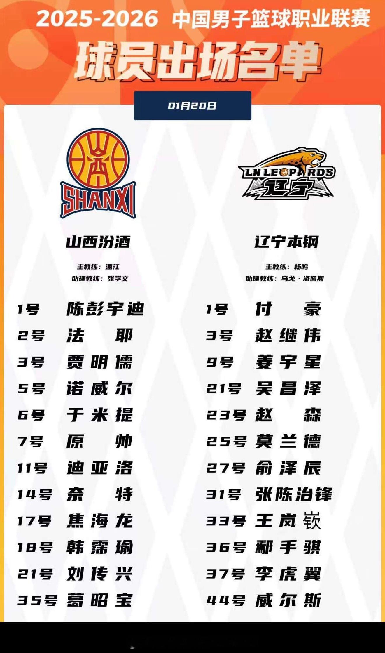 今晚比赛大名单公布:辽宁只有两名外援出战,赵森再次进入名单,山西这边四外援配置,张宁缺席今晚比赛山西男篮vs辽宁男篮