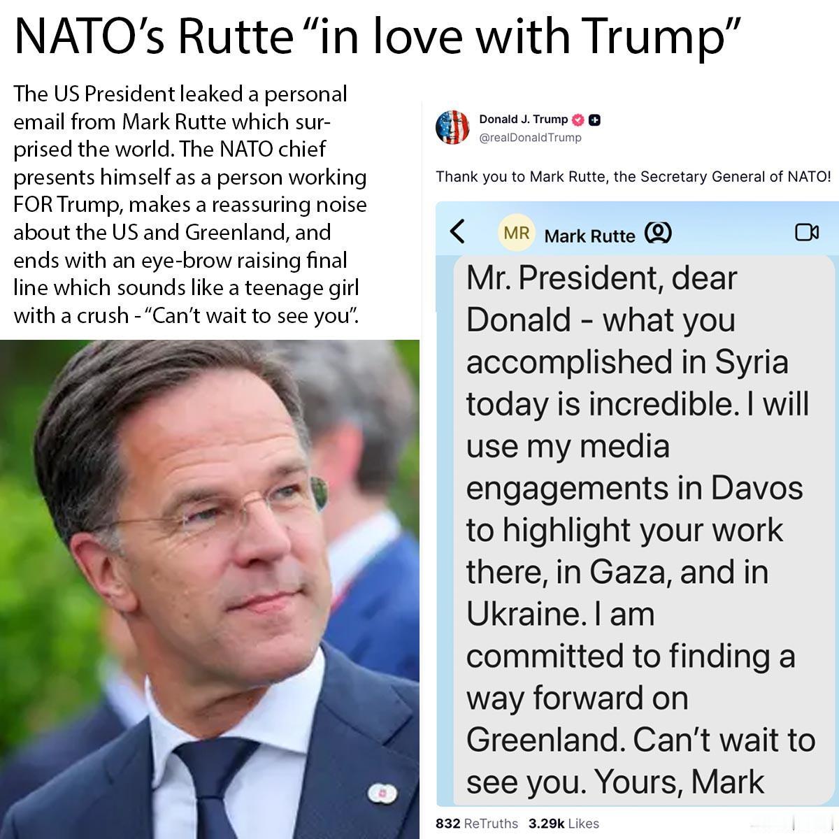“迫不及待地想见到你”—— 吕特这波操作,会不会藏着欧洲 “红白脸”的算计? “Can’t wait to see you”—— 看到北约秘书长吕特发给特朗普的这句话,谁当能他只是说说而已? 明明知道特朗普有晒别人短信的癖好,吕特偏要发这种既谄媚又暧昧的内容,他到底图啥? 难道真的是为了借特朗普的嘴,向世界宣告自己对这位美国政客的 “誓死效忠”? 仔细琢磨,有没有可能答案其实藏在欧洲的两面手法里 —— 就是咱们常说的 “唱红白脸”。 一边,欧盟板起脸来唱白脸:冯德莱恩早就放话,“丹麦和格陵兰的领土主权和完整不容谈判”,死死守住欧洲在北极的地缘利益,不给美国半点趁虚而入的机会。 另一边,吕特就扛起了北约的 “红脸” 角色。为了稳住喜怒无常的特朗普,防止他一时脑热退出北约、对欧加征关税,什么 “迫不及待想见你” 这种近乎 “叫春” 的话,都能面不改色地敲出来。 毕竟,只要特朗普不 “暴走”,欧洲就能在格陵兰问题上,一边硬扛底线,一边继续跟美国周旋。 如果是,那吕特这谄媚的操作,实在是太辣眼睛了! Source: X