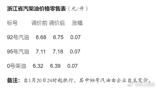#油价新年首涨就在今晚24时#【新年首涨,就在今晚,92号汽油上调7分钱一升】#油价新年首涨92号汽油上调7分一升# 在1月6日因调价金额不足50元/吨而搁浅后,今天(1月20日)晚上,国内成品油价格迎来了新年首次上调。据国家发改委通知,今天24时,国内汽、柴油价格均上调85元/吨。据浙江省发改委消息,此次调价后,我省92号汽油为6.75元/升,每升上调7分钱,继续维持在“6”字头;95号汽油为7.18元/升,同样每升上调7分钱;0号柴油为6.39元/升,每升上调7分钱。刚刚过去的2025年,国内成品油价格共经历了“七涨十二跌六搁浅”。以浙江省92号汽油为例,2025年累计下调幅度达到 0.73元/升,价格创下了四年半来的新低,私家车加满一箱油(以50升计算)可节省36.5元钱。金联创分析认为,本轮计价周期内,地缘冲突等因素使得国际原油价格呈现上涨趋势。具体来看,中东地区因伊朗国内抗议活动升级,美国特朗普政府释放强硬态度并出台制裁政策,市场担忧伊朗原油供应缩减;俄罗斯方面,多艘相关油轮遇袭或被扣押,俄油供应前景引发投资者担忧。从需求端来看,OPEC最新报告维持2026年需求增长预测,全球日均石油需求较前一年增长138万桶,需求增长空间有限。金联创表示,短期内,原油价格维持波动为主,新一轮零售价存在搁浅可能,调价窗口期为2026年2月3日。这也是春节前的最后一次调整。(潮新闻 记者 王燕平)