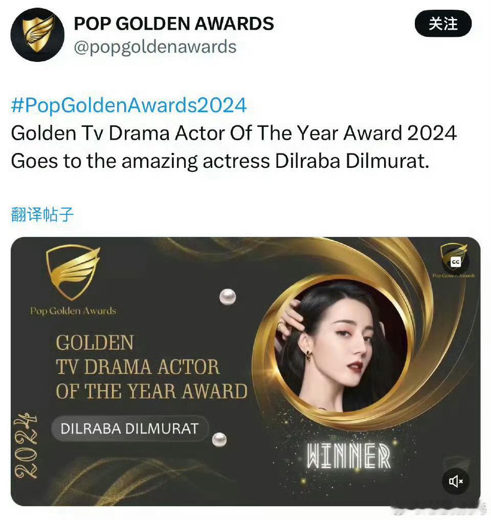 迪丽热巴又一次拿到Pop Golden Awards「年度最佳影视剧演员」奖项