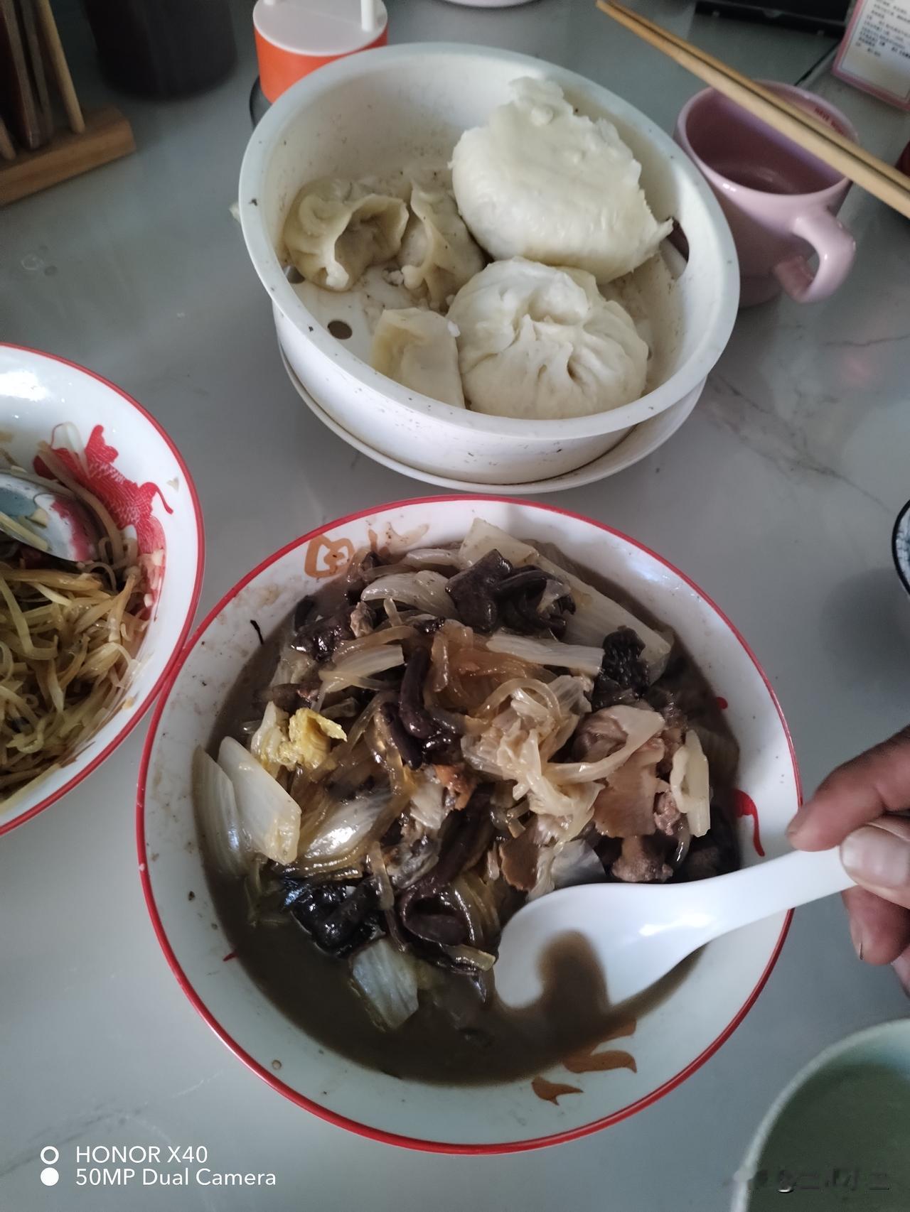 中午叫老公回家吃饭,他最近时间很宽裕,早上八点半出去,下午两点多回来。我煮了一锅高粱米饭🍚,在蒸屉上给他热了一个包子一个馒头还有四个饺子。做了一个凉拌土豆丝,上网查查怎么调味,感觉今天做的很成功。关键是火候,得到了老公的夸奖! 蘑菇里面兑了点白菜又热了一下。简简单单的,每天两顿饭!