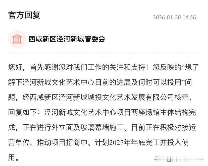 咨询泾河新城文化艺术中心进展 想了解下泾河新城文化艺术中心目前的进展及何时可以投用。 官方回复 2026-01-20 14:56 西咸新区泾河新城管委会 您好,首先感谢您对我们工作的关注和支持!您反映的“想了解下泾河新城文化艺术中心目前的进展及何时可以投用”问题,经西咸新区泾河新城城投文化艺术发展有限公司核查,回复如下:泾河新城文化艺术中心项目两座场馆主体结构完成,正在进行外立面及玻璃幕墙施工。目前正在积极对接运营单位,推动项目招商中。计划2027年年底完工并投入使用。 西安