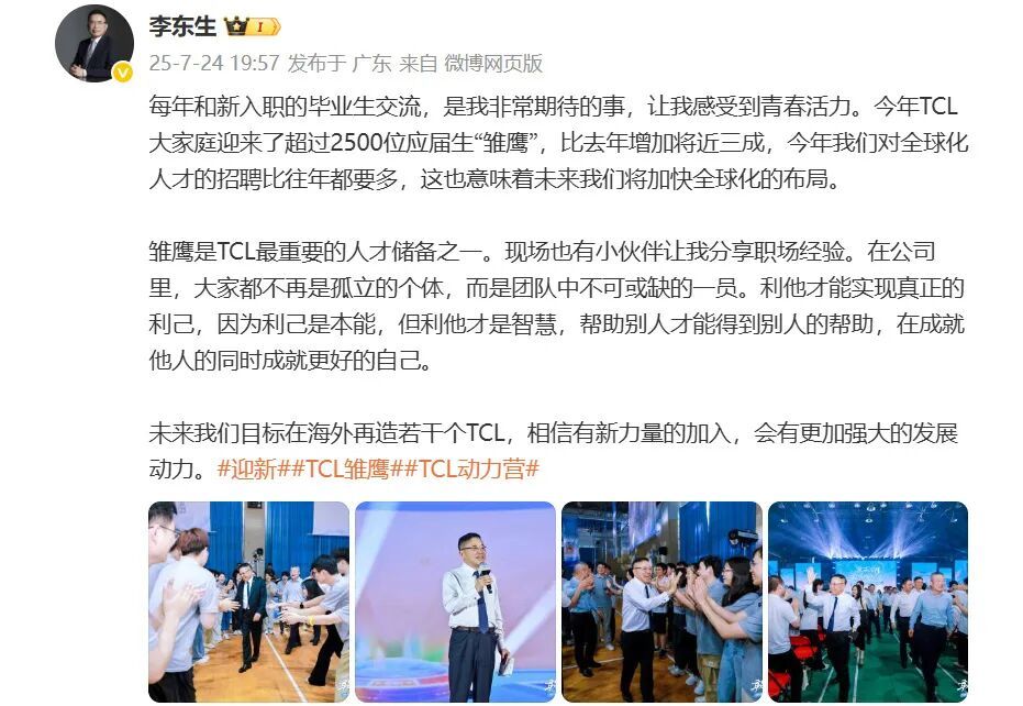 同期,李在微博中写到,2025年TCL将迎来超过2500位应届生,同比增加近三成,尤其对全球化人才的招聘比往年都多,这暗示其将加快全球化布局。