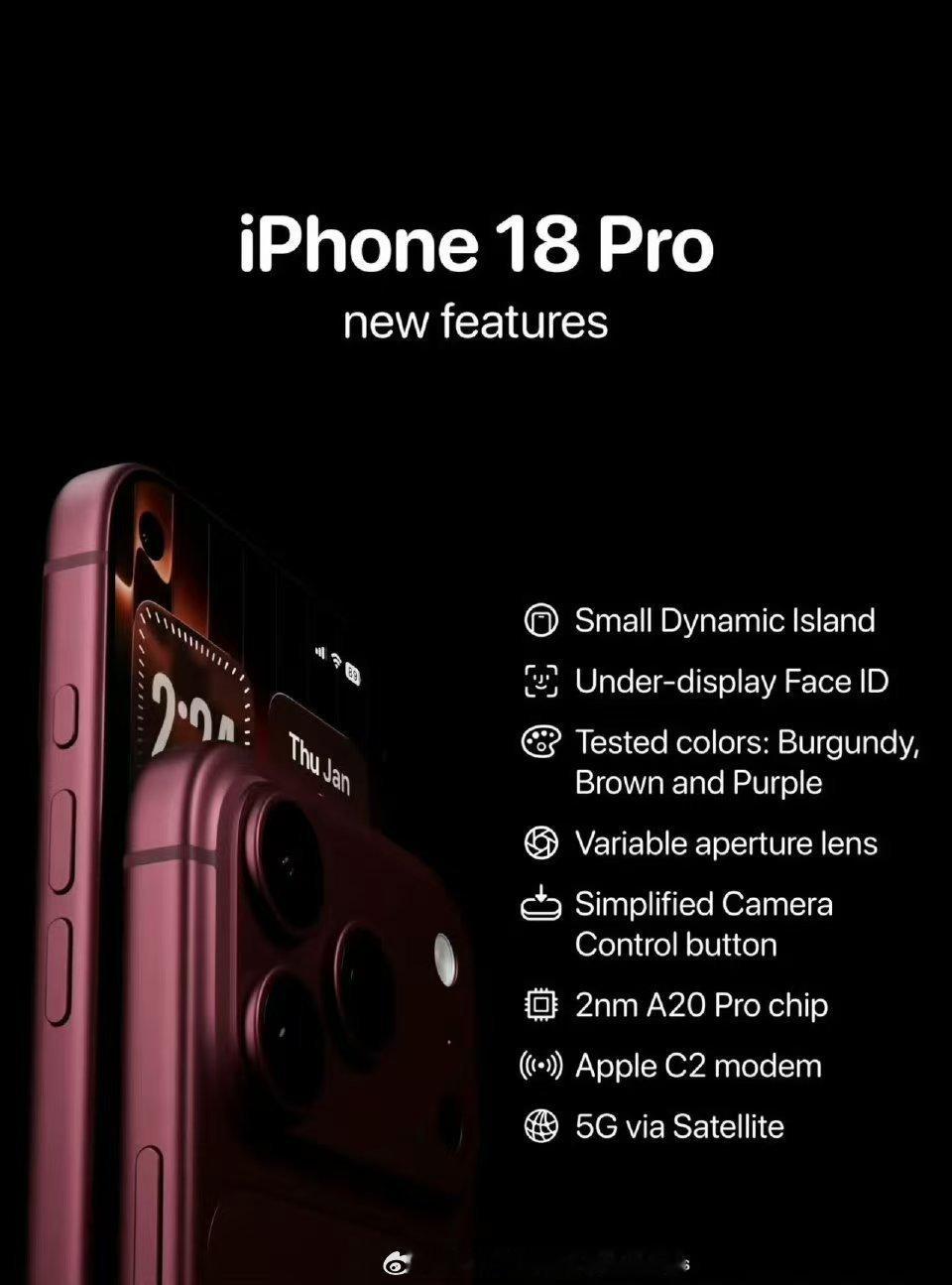 iPhone18Pro外观放弃药丸屏 用了三年的“药丸”终于下岗,换成了一个小小的单挖孔,灵动岛也跟着挪到了左上角。说白了就是苹果把Face ID的传感器藏到屏幕底下了,技术终于跟上了。这下正面看着更干净,屏占比也更高了。背面摄像头模组还是那个熟悉的样子,从iPhone X的“厚刘海”,到现在快接近“无孔”,这样的iPhone18 Pro喜欢吗