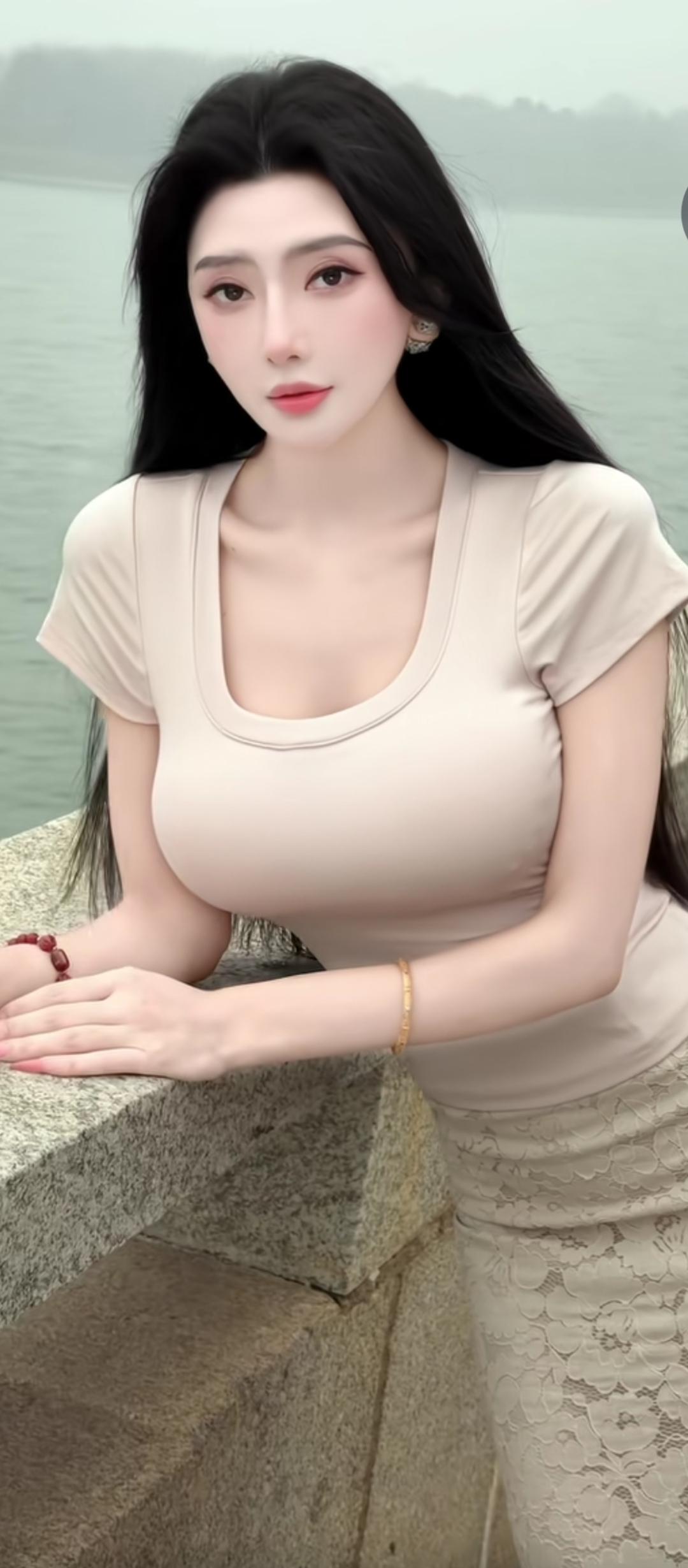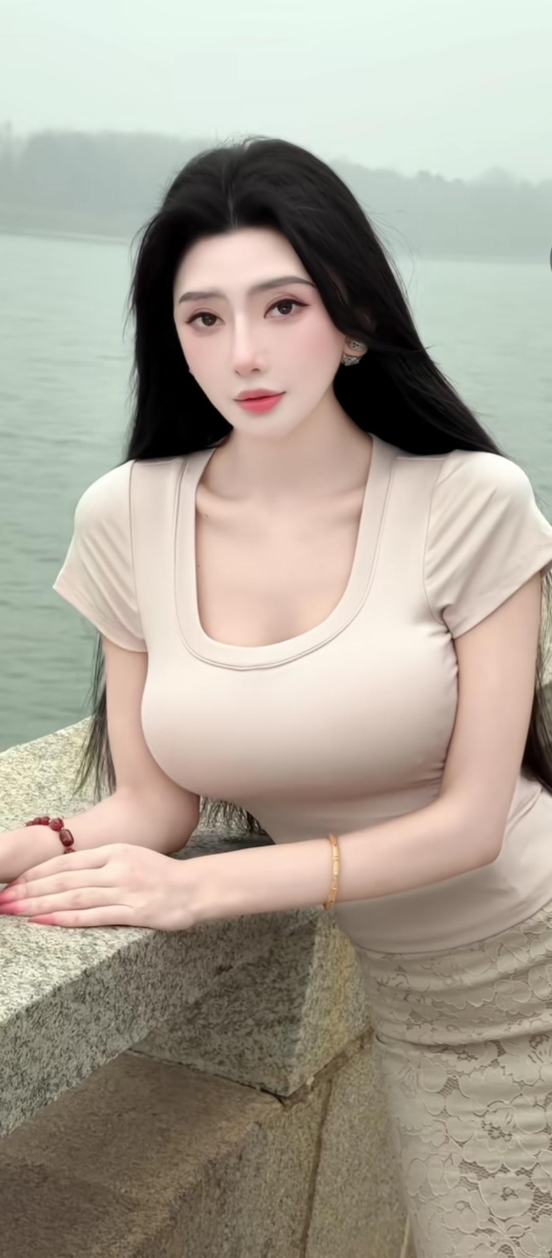 湖畔静思,黑发美人倚栏杆,悠然自得。