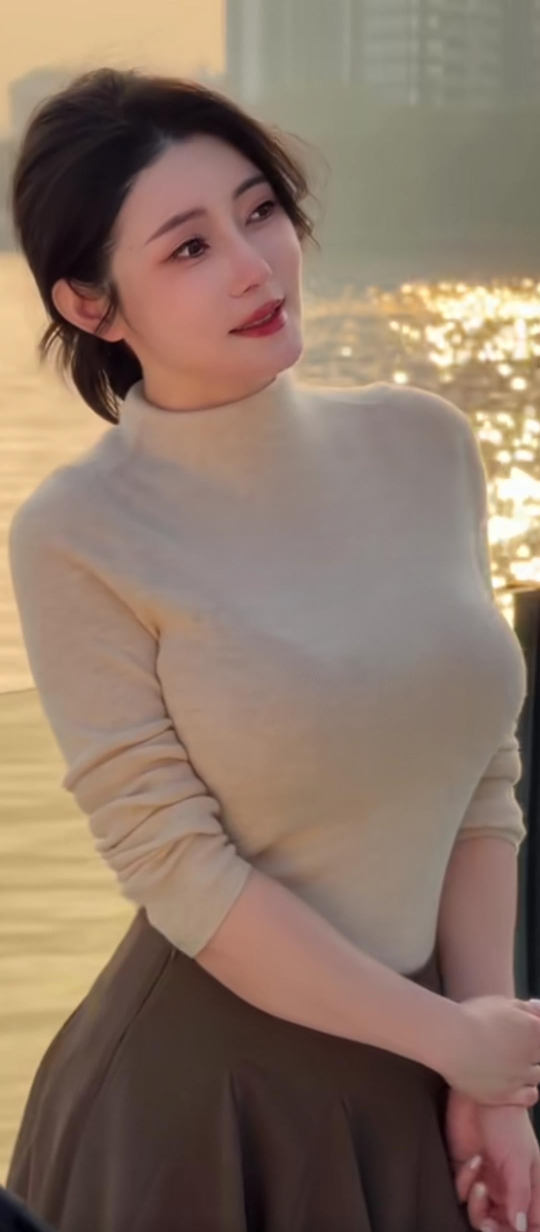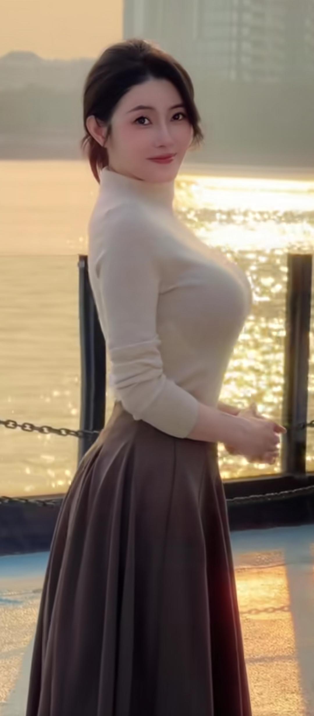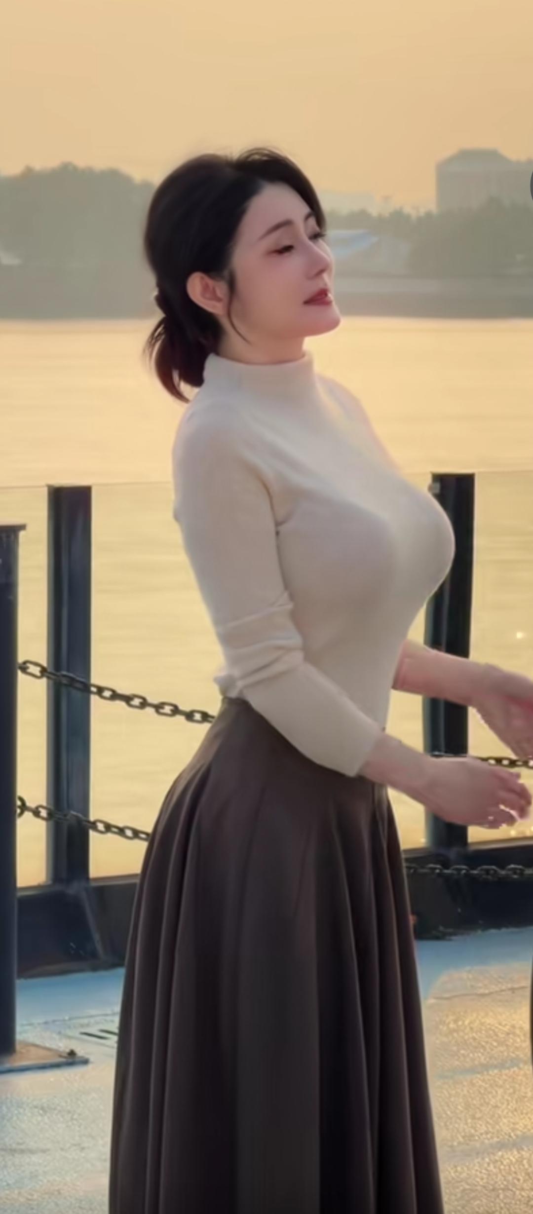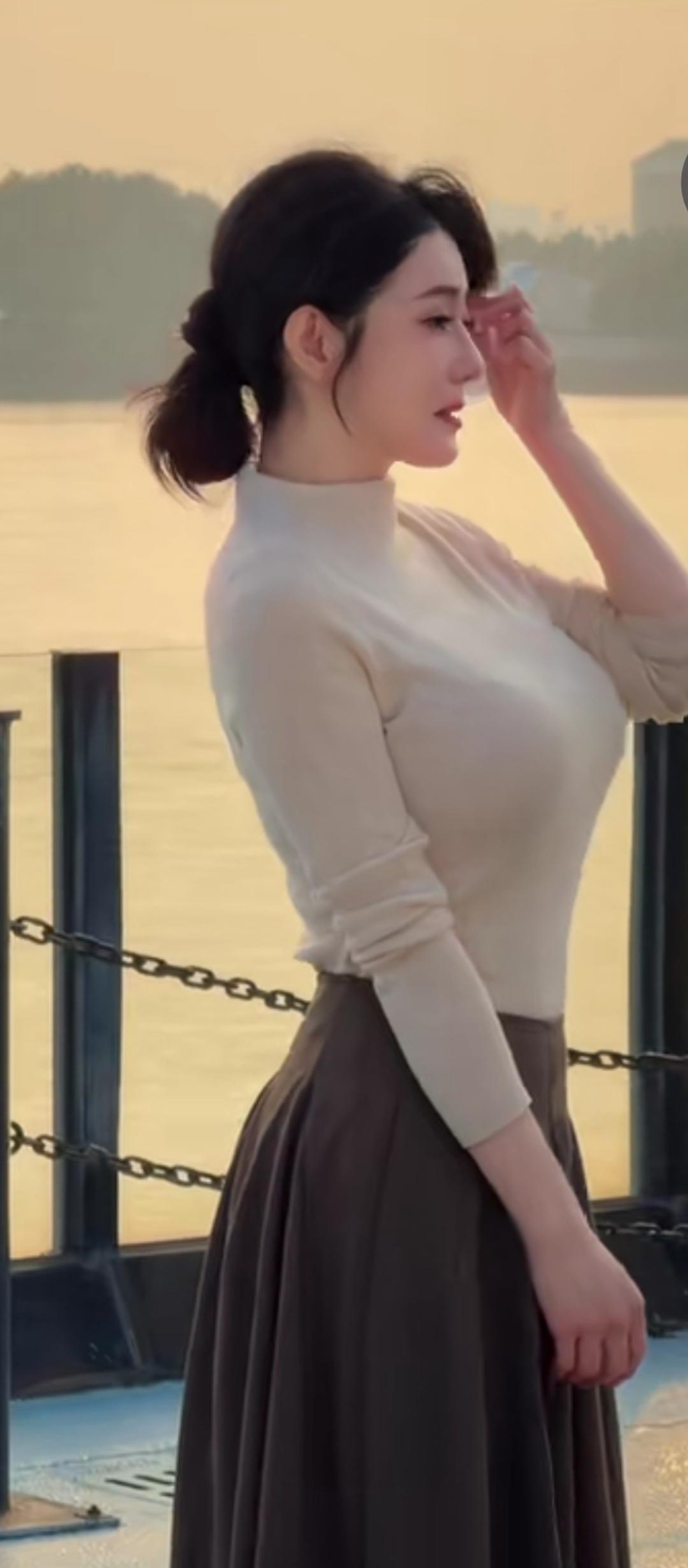 湖畔静思,黑发美人倚栏杆,悠然自得。