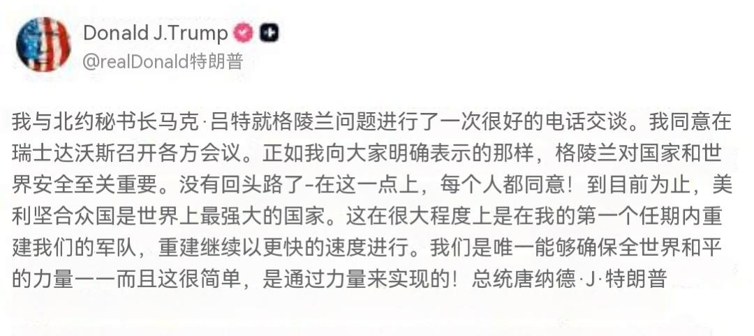美国总统唐纳德·特朗普:"我与北约秘书长马克·鲁特就格陵兰岛问题进行了非常好的电话交谈。我同意在瑞士达沃斯举行各方会议。正如我向大家明确表示的,格陵兰岛对国家和世界安全至关重要。没有回头路——对此,大家都达成了共识!美国是全球最强大的国家,这在很大程度上得益于我在首届任期内重建军队的工作,而这项重建工作目前正以更快的速度推进。我们是唯一能确保世界和平的强国——而这完全是通过实力来实现的!唐纳德·J·特朗普总统。"特朗普称无论如何都要拿下格陵兰岛特朗普说绝对需要格陵兰岛