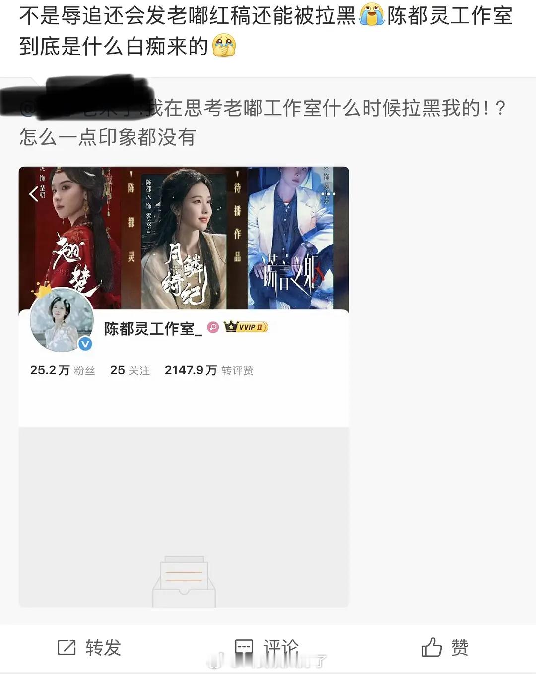 陈都灵工作室拉黑的里面看起来是有粉丝吗?不是辱追只发红稿也被拉黑了?