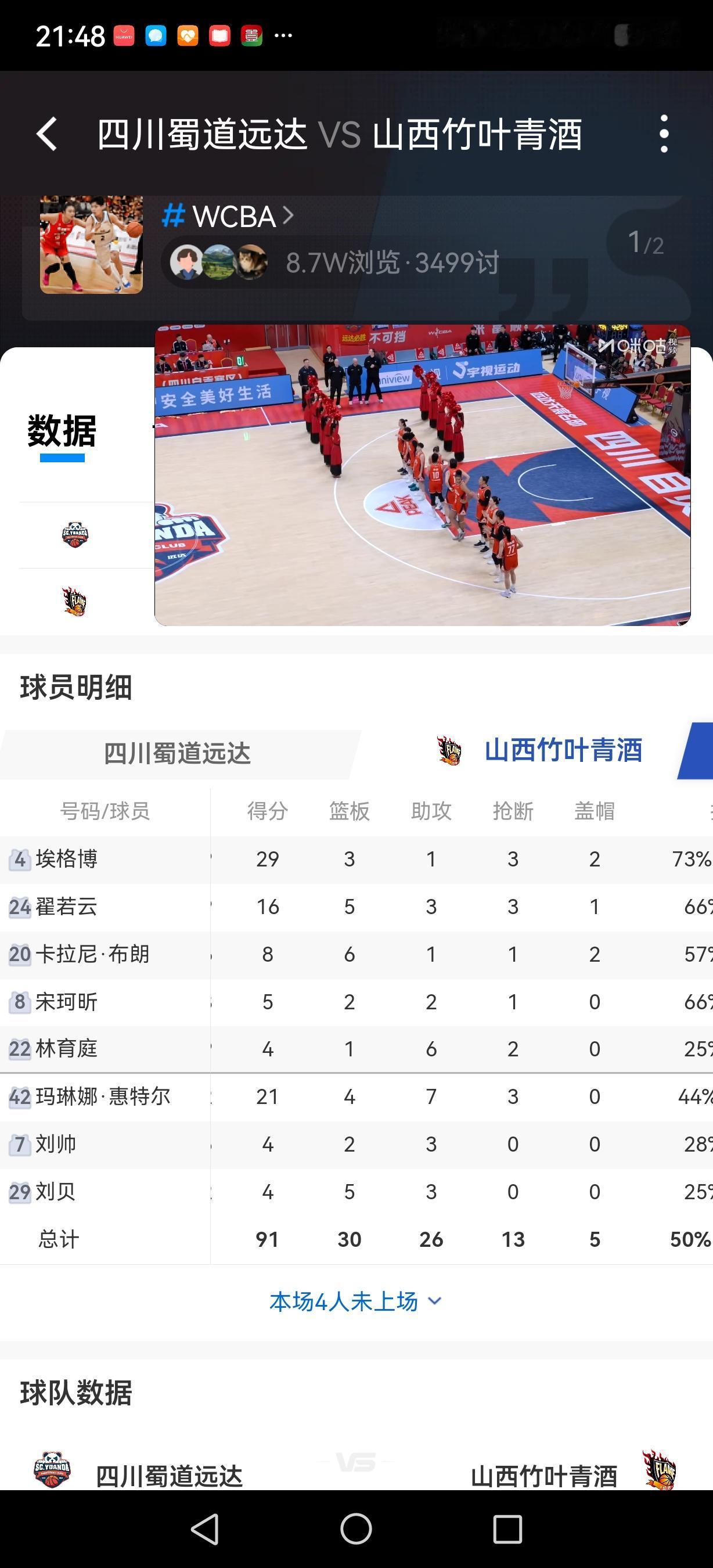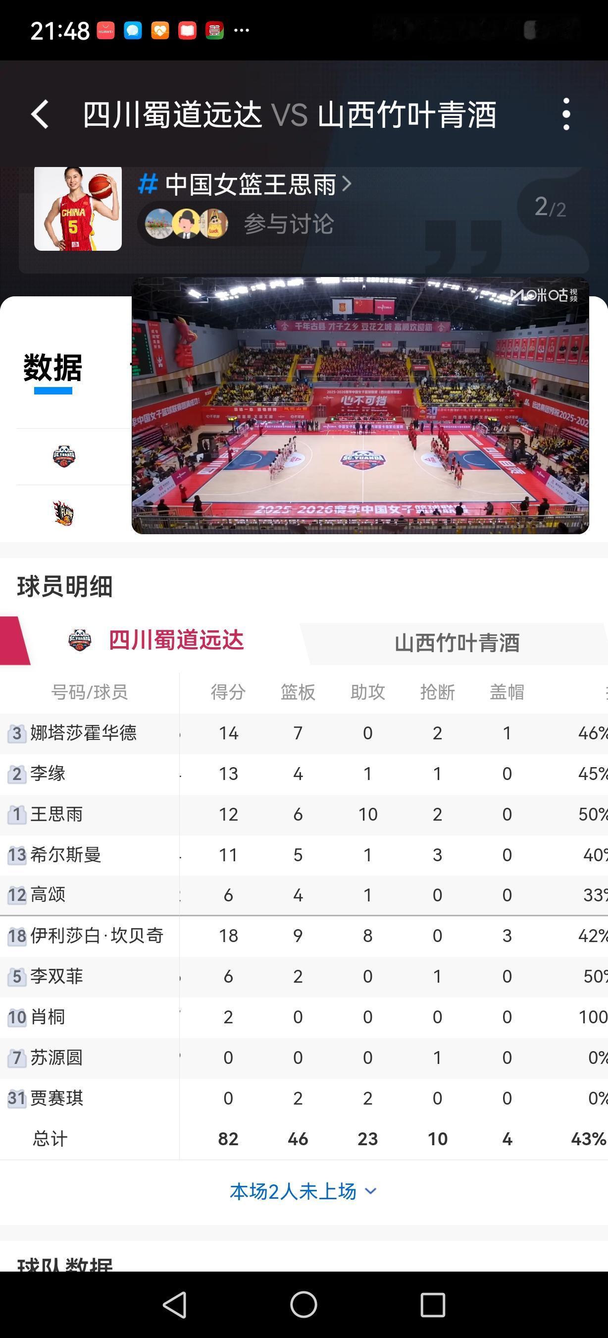 2026年1月20日晚,WCBA 一场关键比赛中,山西女篮91:82战胜四川女篮。 四川队5人得分上双,巨无霸坎贝奇18分9个篮板8个助攻3盖帽。王思雨12分,6个篮板,10次助攻。自从韩旭李梦离开以后,四川队的战斗力下降,已经连输了好多场次。 山西队埃格博29分3板,翟若云16+5+3+3。惠特尔21+4+7。山西队的外援得分能力较强,整体战斗力攀升。 女篮cba 女篮身高 篮球四川女篮