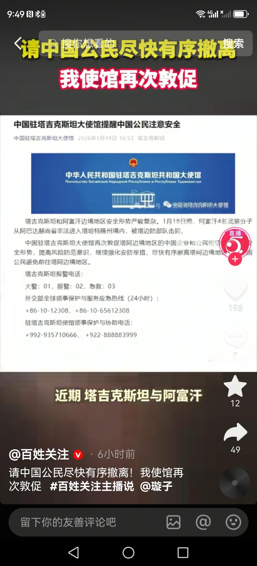 咱们中国同胞注意啦!塔吉克斯坦和阿富汗交界的地方突然爆发冲突,驻塔吉克斯坦大使馆已经紧急发消息,让大家赶紧撤离。 塔吉克斯坦跟阿富汗交界的边境最近又不太平了!昨晚就有4个武装人员偷偷越境,结果被当场打死,现在那边的情况一下子就紧张起来了。 使馆连着发了两次提醒:在边境地区的同胞,赶紧撤回来!千万别去那些危险的地方瞎晃悠。对了,火警01、匪警02、急救03这些号码,现在就赶紧存手机里,真到了紧急时候,说不定能救自己命呢。 最让人心里揪着疼的是,这已经是使馆第二次让大家撤离了。上一次提醒才过去没多久吧?在边境做买卖的老李就说过:"店里的货架都还没来得及收拾好,子弹就嗖嗖地从屋顶飞过去了。" 想想都觉得后怕!还有些人还在犹豫要不要走,真的别拿自己的命去赌那个小概率的运气。咱们使馆连24小时的求助热线都准备好了,这次的处理方式可真是够给力的。 (互动)在边境做生意,风险高但回报也可能大,要是换作是你,你敢冒险去那边闯一闯吗? -search.byteimg.com/img/labis/89581f7ba6506a507cf974127f9d7a10~480x480.PNG中亚塔吉克 阿富汗军事冲突 俄塔吉克斯坦 塔吉克斯坦族 塔吉克族士兵 塔吉克斯坦旅游 巴阿边境冲突