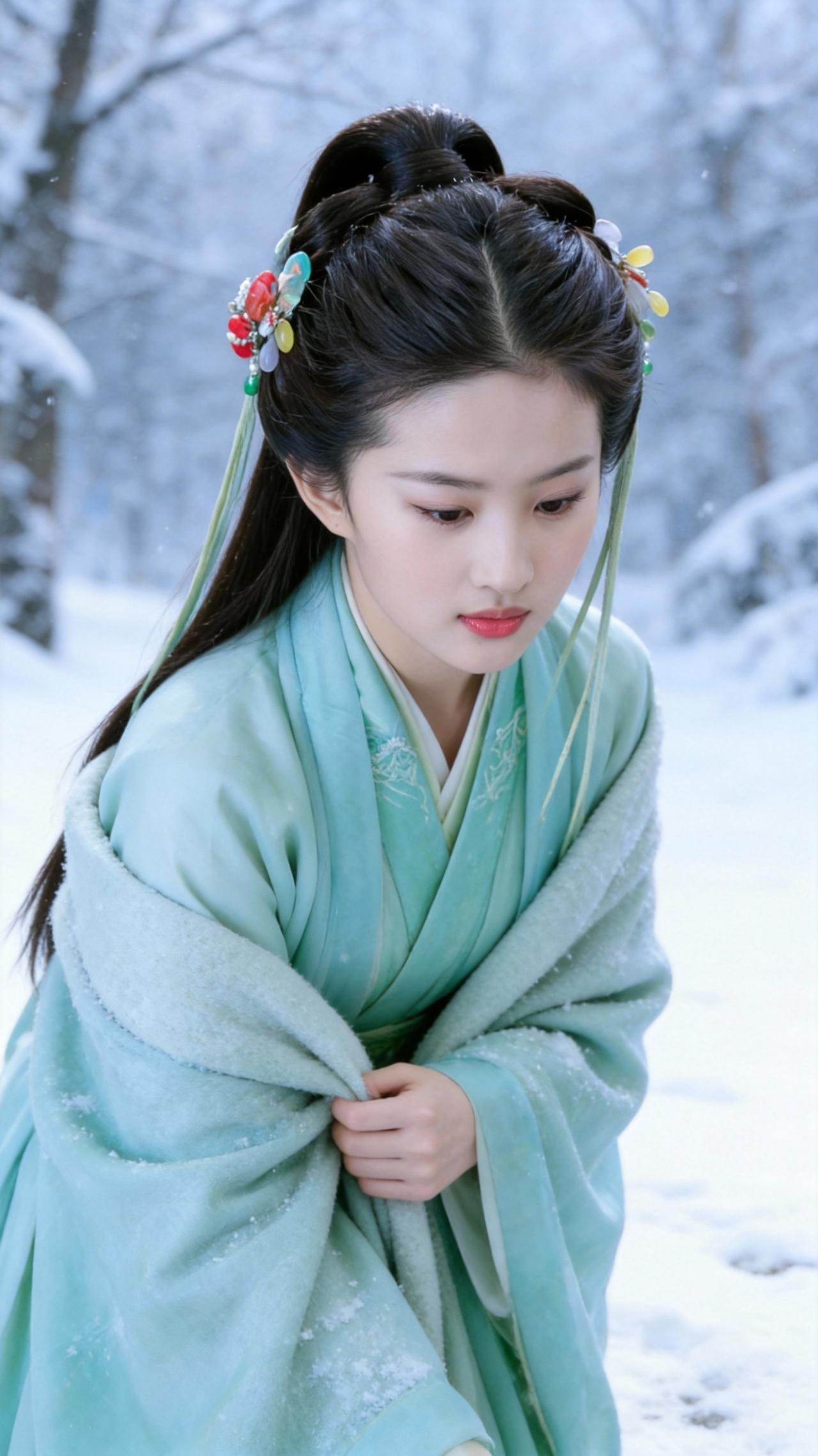 雪落在松枝的骨节上 也落在她肩头的绒毯 像谁抖落了满捧的月光 青绿色的裙角 是雪地里唯一的春 发间的彩饰 是冻住的星子 她拢紧披风 像拢住一整个冬天的风 睫毛垂落时 抖落细碎的雪 林间没有脚印 只有她的呼吸 在白茫里 轻轻漾开一朵云 现代诗 刘亦菲