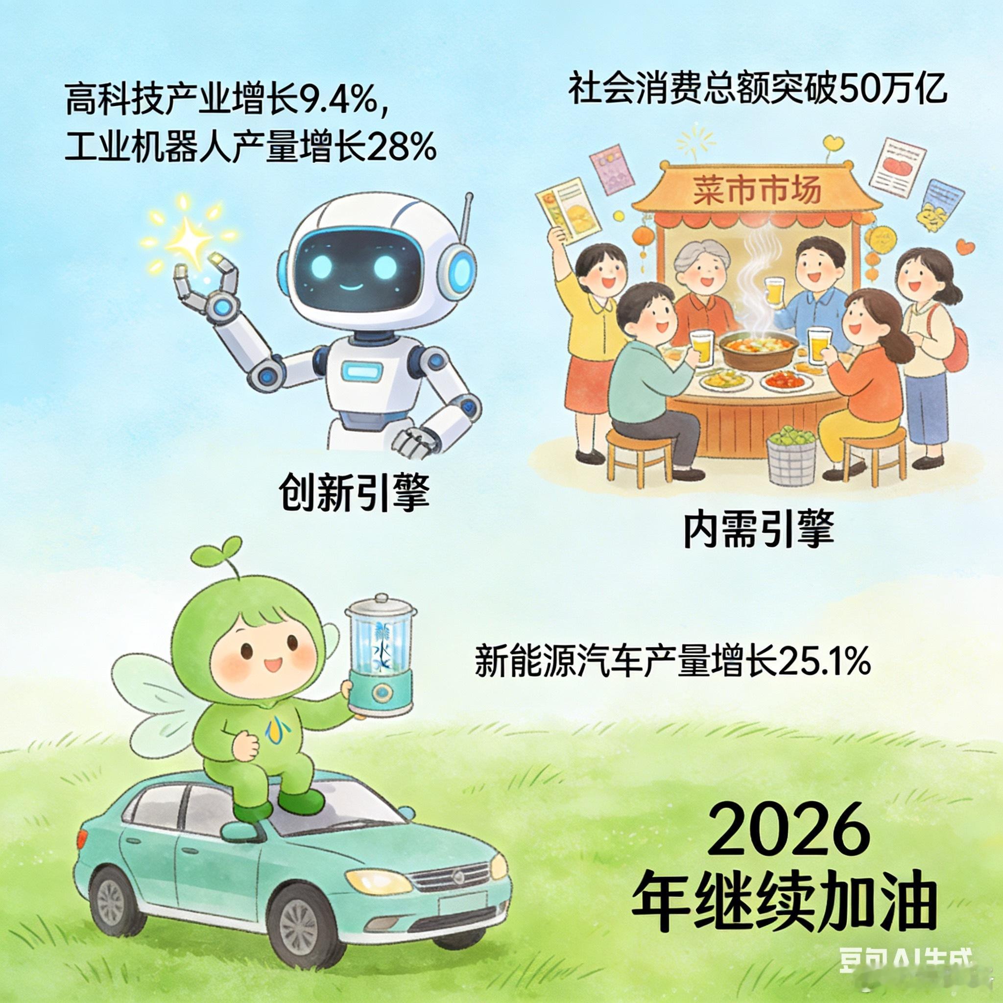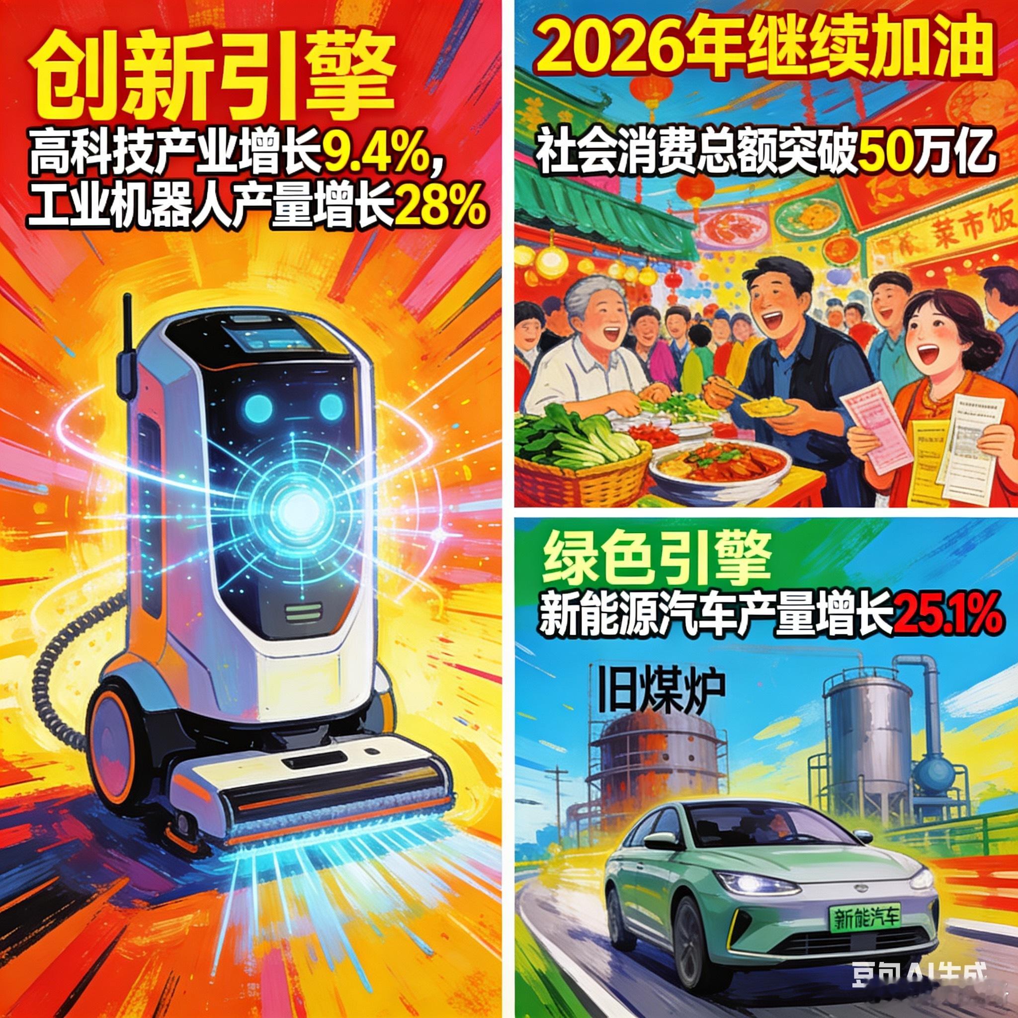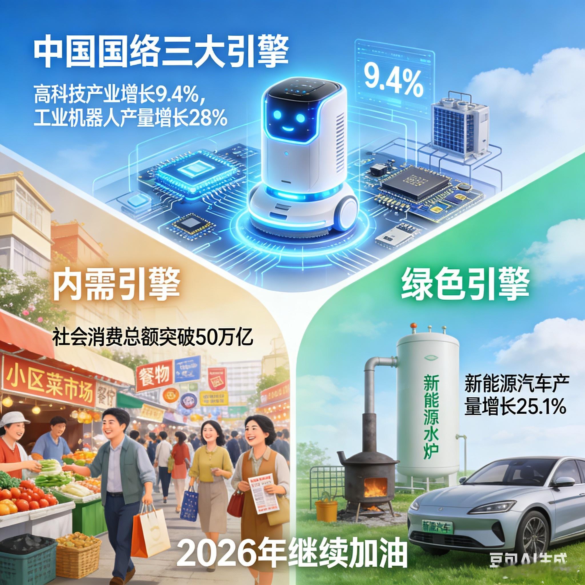 2025年中国经济成绩单出炉啦!GDP突破140万亿,全靠这三大引擎在使劲👇🔧 创新引擎就像给家里换了个新的智能扫地机器人,干活又快又好!高科技产业增长9.4%,工业机器人产量增长28%。意思是咱们造东西越来越聪明、越来越快,效率拉满!🛍️ 内需引擎好比小区门口的菜市场和餐馆天天都挤满人,热闹非凡!社会消费总额突破50万亿,旅游、看演出、逛商场的人越来越多。大家愿意花钱、敢花钱,把经济的烟火气给点旺了!🌱 绿色引擎就像把家里的旧煤炉换成了省电又干净的新能源热水器!新能源汽车产量增长25.1%,咱们的能源更安全、环境也更干净。经济发展的同时,天更蓝了,空气也更好了!这三大引擎一起发力,咱们的日子肯定越过越红火!2026年继续加油💪三大引擎点亮2025中国经济三大引擎点亮2025中国经济