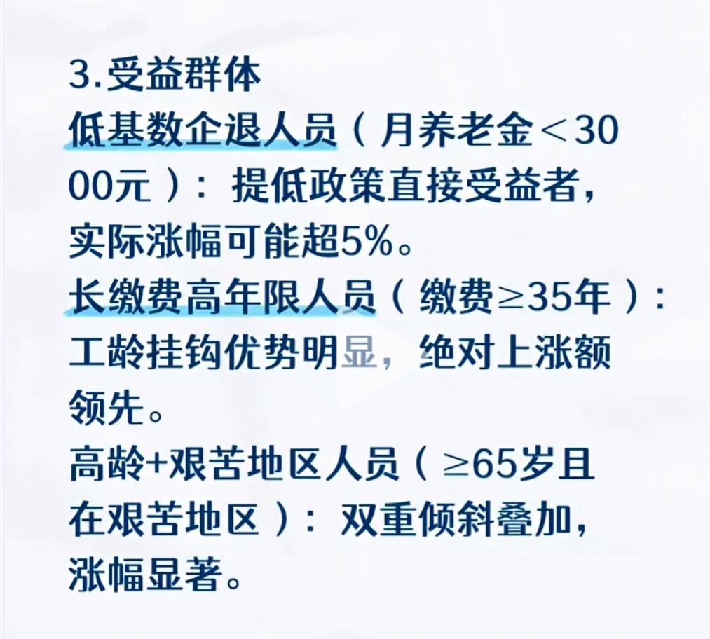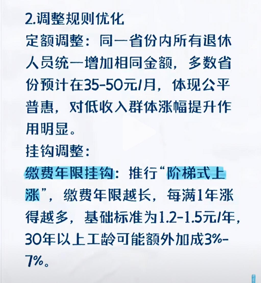 2026年的调整轮廓已清晰呈现。 对广大退休人员来说,有一个关键的确定性:养老金继续上涨是大概率情况。 2026年的调整逻辑正从以往的“普遍普涨”悄然转变为“提低控高、精准倾斜”,以此确保社会保障的公平本质。 2026年养老金总体涨幅预计会继续保持在“2%左右”的温和范围。 预计2026年将继续采用“定额调整+挂钩调整+适当倾斜”相结合的办法。在这一模式下,三类群体预计会有更强的获得感。 第一,缴费年限长的退休人员。调整机制会持续激励“长缴多得”。部分分析表明,对于缴费年限超30年,特别是拥有40年以上工龄(含视同缴费年限)的退休人员,在挂钩调整部分可能享有更优的计算系数,从而切实从调整中获益。 第二,高龄退休人员。高龄倾斜的力度有望进一步加大,且门槛可能降低。有消息传出,一些地区正考虑把享受额外高龄补贴的年龄门槛从70周岁降至65周岁,让更多“年轻”老人更早感受到关怀。通常年龄越大,获得的倾斜金额也越高。 第三,艰苦边远地区退休人员。为弥补这些地区较高的生活成本,国家会通过倾斜调整给予额外补助,保障他们的基本生活水平不会因地域因素而降低。