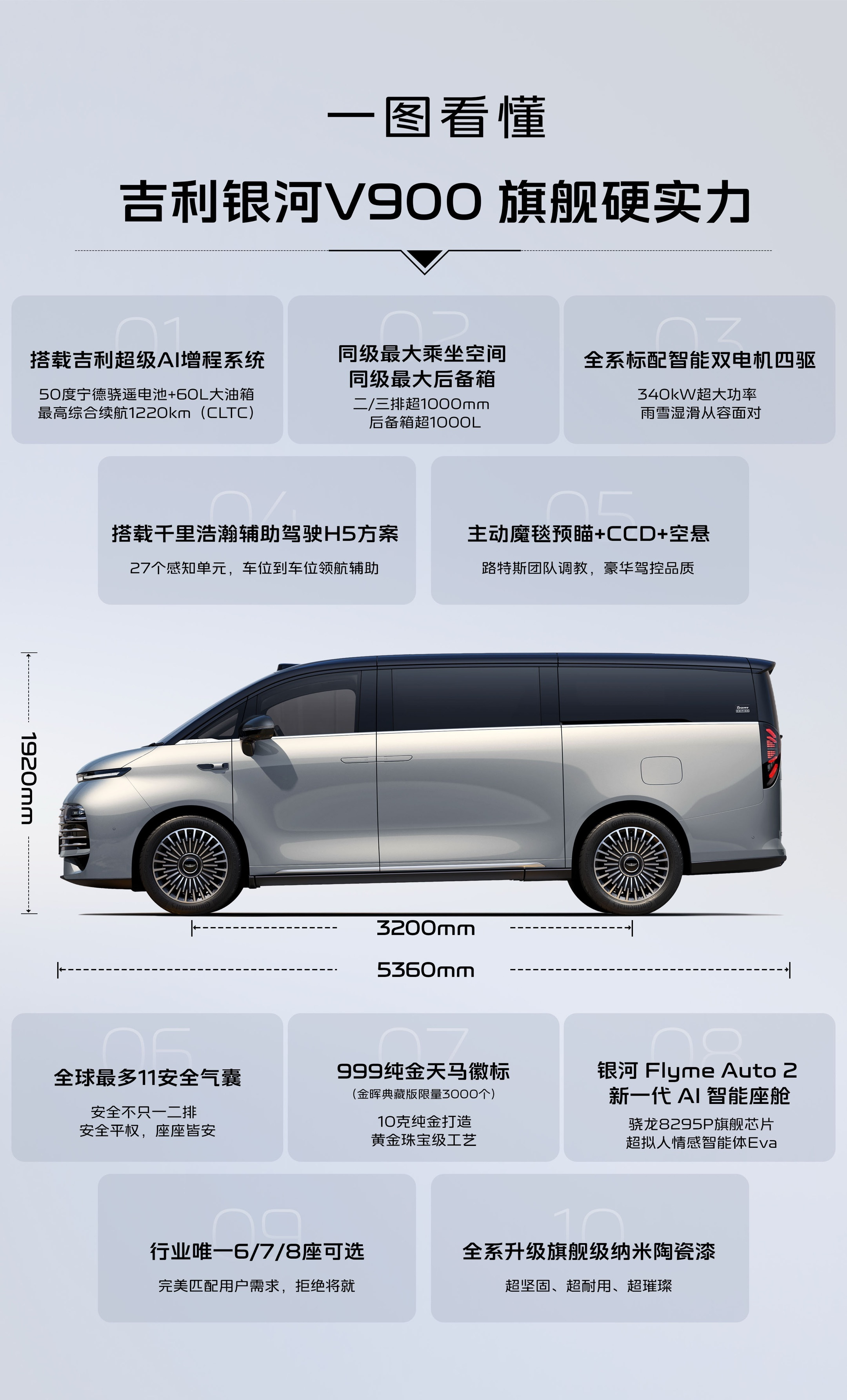 情况就是这样。之前说过这个平台并非专门乘用,而是个空间大、带宽大、载重能力强的客货两用平台。不过曾经有大计划的NOA平台现在看来是难以铺开了,5米9的长轴、封闭车身的货车版、2+1布局龙椅版可能都不会上,有点可惜。嫌大嫌贵的可以等等CMA3.0的吉利牌插混MPV,那车估计和银河M9差不多价钱,不出意外你还能拿个双叉臂。