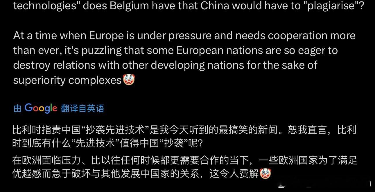 比利时国家安全部门报告抹黑中国比利时在中国几乎没存在感,但不妨碍它刷存在感。所以比利时有什么先进技术值得“窃取”?怎么做巧克力吗欧洲现在都乱成这样了,某些国家还是放不下说教发展中国家的傲慢姿态,执意破坏关系。欧洲的福报还在后头呢。