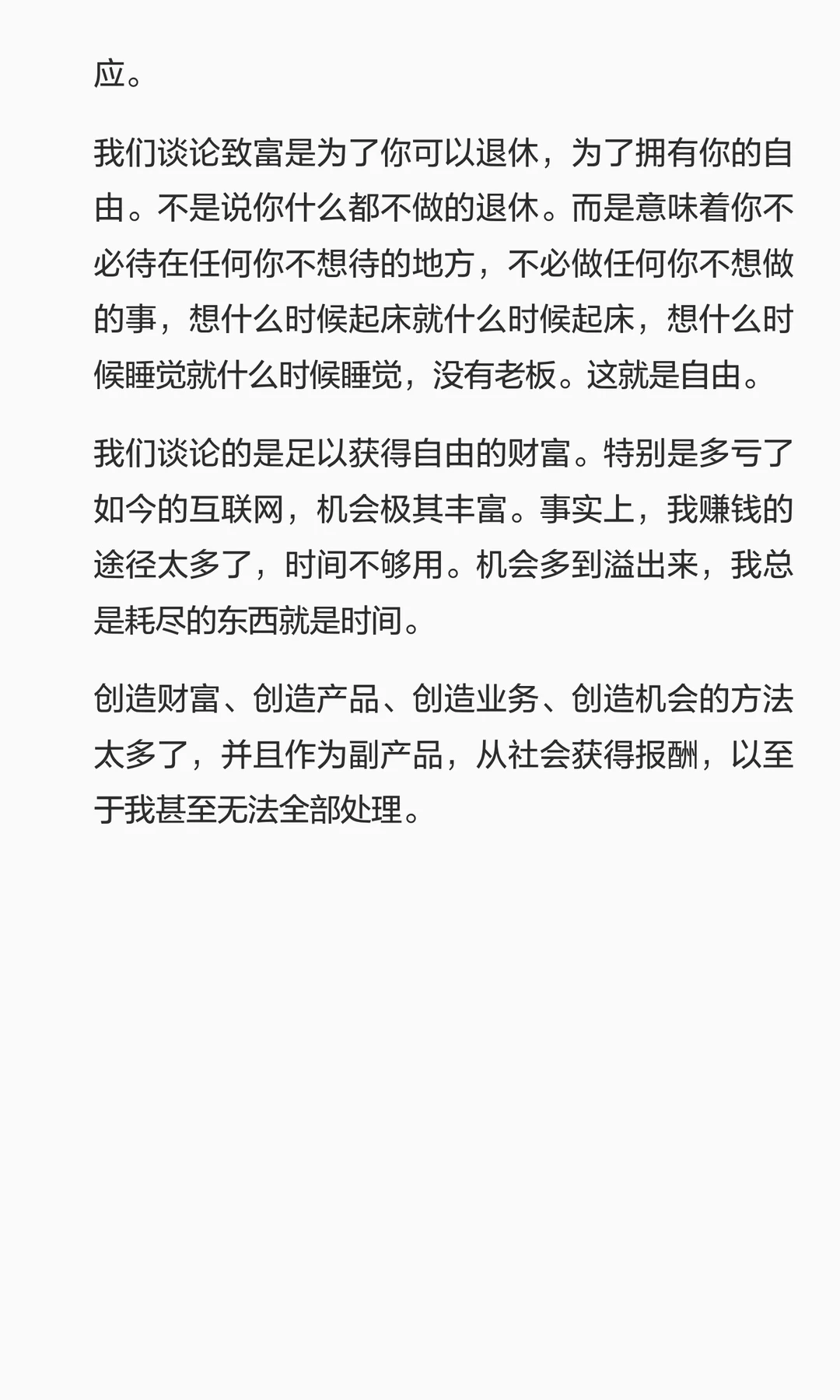 创造财富、创造产品、创造业务、创造机会的方法太多了,并且作为副产品,从社会获得报酬,以至于我甚至无法全部处理。